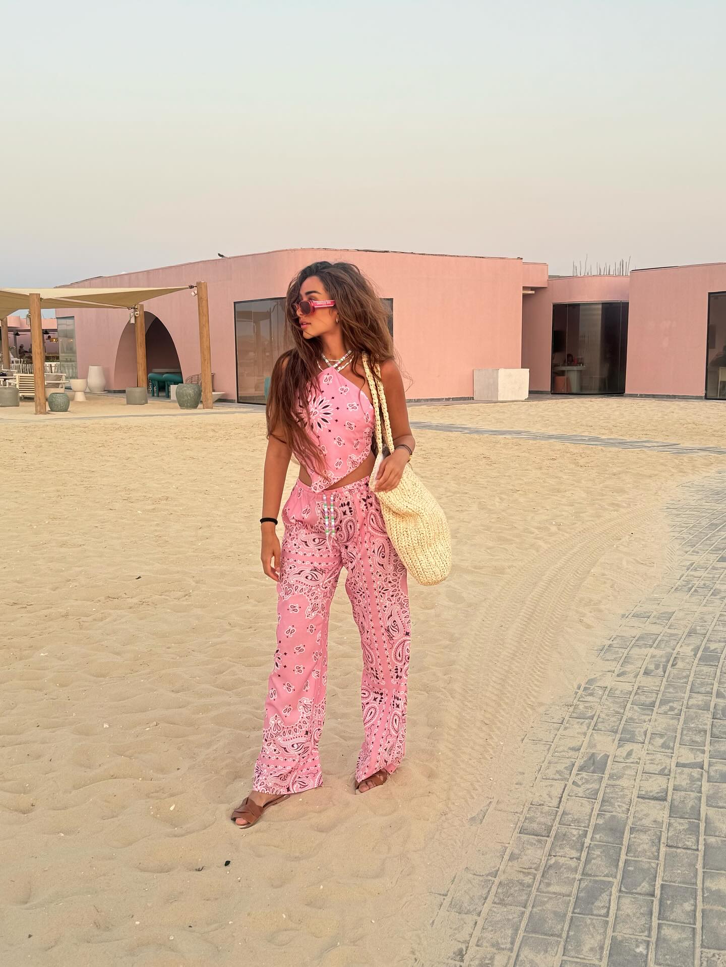 على الشاطئ، اعتمدت هنا الزاهد أسلوباً بوهيمياً مريحاً، حيث ارتدت طقم وردي من قطعتين مزين بنقشة الباندانا، يتألف من توب قصير مربوط حول العنق وبنطال واسع، مع حقيبة كبيرة من القش ونظارات شمسية عصرية، ما منحها إطلالة حيوية وعملية تناسب أجواء البحر.