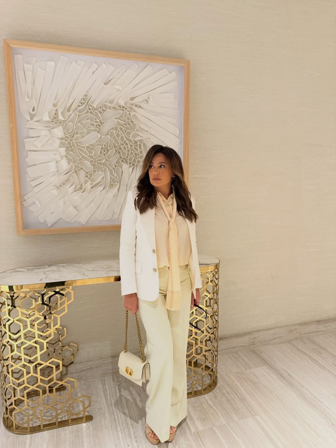 ارتدت النجمة المصرية بليزر كلاسيكي باللون الأبيض وبنطلون واسع عالي الخصر باللون العاجي، مع قميص حريري بربطة عنق ناعمة وحقيبة كتف صغيرة مونوكروم، مكياج هادئ وشعر ويفي طبيعي، لتجسّد الأسلوب الخريفي الناعم والأنيق.