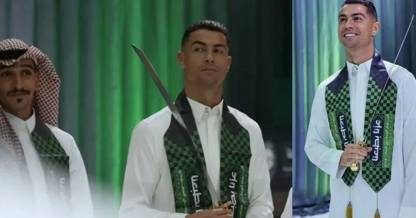 ونشر رونالدو على حسابه في منصة "إكس" صورة يظهر فيها وهي يرتدي الزي السعودي ووشاحا حمل عبارة "عزنا بطبعنا".