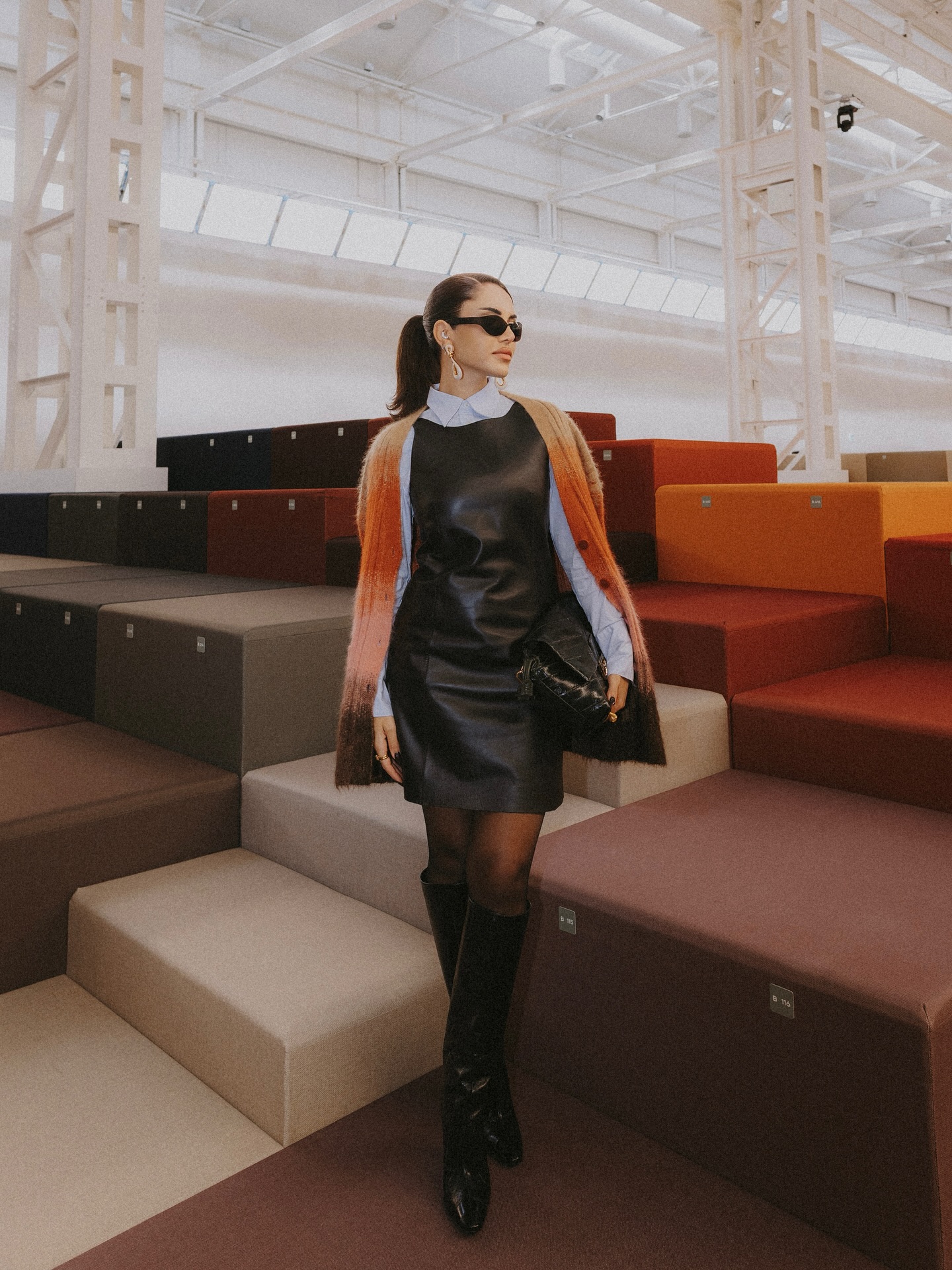 أطلت بفستان قصير من الجلد الأسود فوق قميص أزرق طويل الأكمام، مع كارديغان صوفي طويل بألوان دافئة متدرجة، نسّقته مع حقيبة كلاسيكية سوداء وبوت جلدي طويل، لتظهر بمزيج يجمع الرسمية بالعصرية.