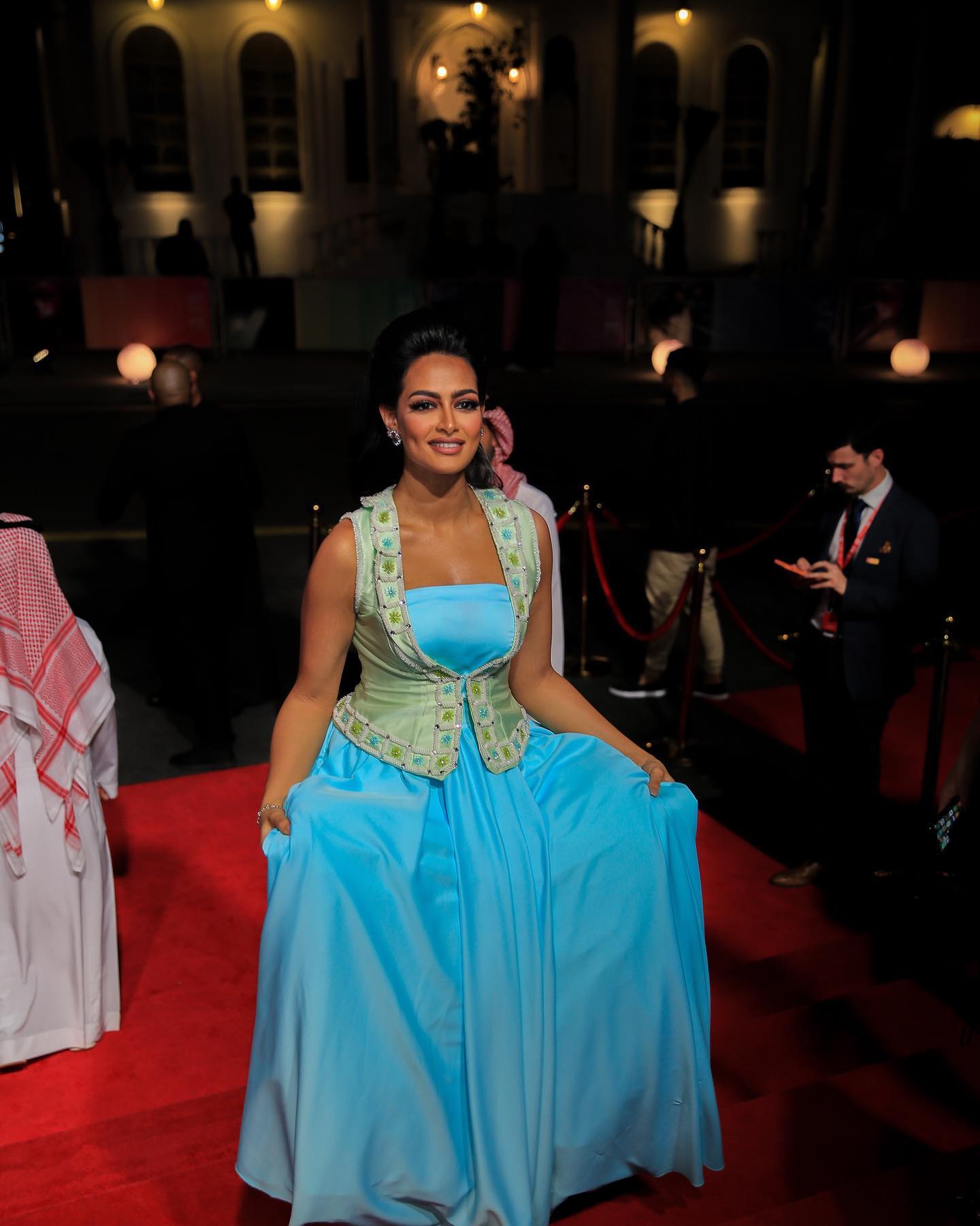 من أبرز إطلالاتها الملكية كان فستان أزرق راقٍ من تصميم Hana Zooda مطرز عند الصدر والأكتاف مع كاب طويل يضفي قوة إضافية على حضورها. كما ظهرت بفستان بنفسجي داكن من Tima Abid مزين بورود ذهبية ثلاثية الأبعاد، عكس الفخامة والرقي بأسلوب درامي لافت.
