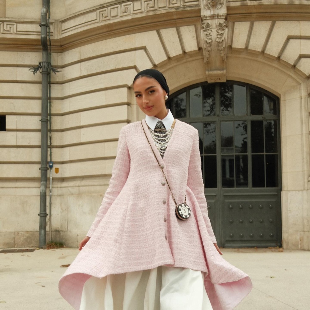 وفي إطلالة أخرى، ظهرت يارا بمعطف وردي فاتح من شانيل بتصميم غير متماثل، أضاف حركة انسيابية وأناقة حالمة، نسقته مع قميص أبيض وتنورة واسعة باللون ذاته. هذه الإطلالة جمعت بين الرقي والأنوثة ببراعة، واختارت حجابًا أسود بسيطًا ليكسر الألوان الفاتحة بتباين جذاب ومتوازن.