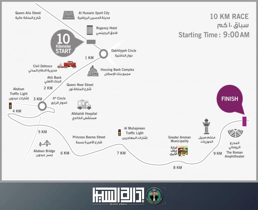 - كما ستشمل الإغلاقات كذلك شارع عقبة بن نافع وشارع الأميرة بسمة بشكل كامل، وذلك من الساعة السابعة صباحاً وحتى الساعة الثانية عشرة ظهراً، ضمن مسار سباق الـ10 كم الذي ينطلق في الساعة التاسعة صباحاً..