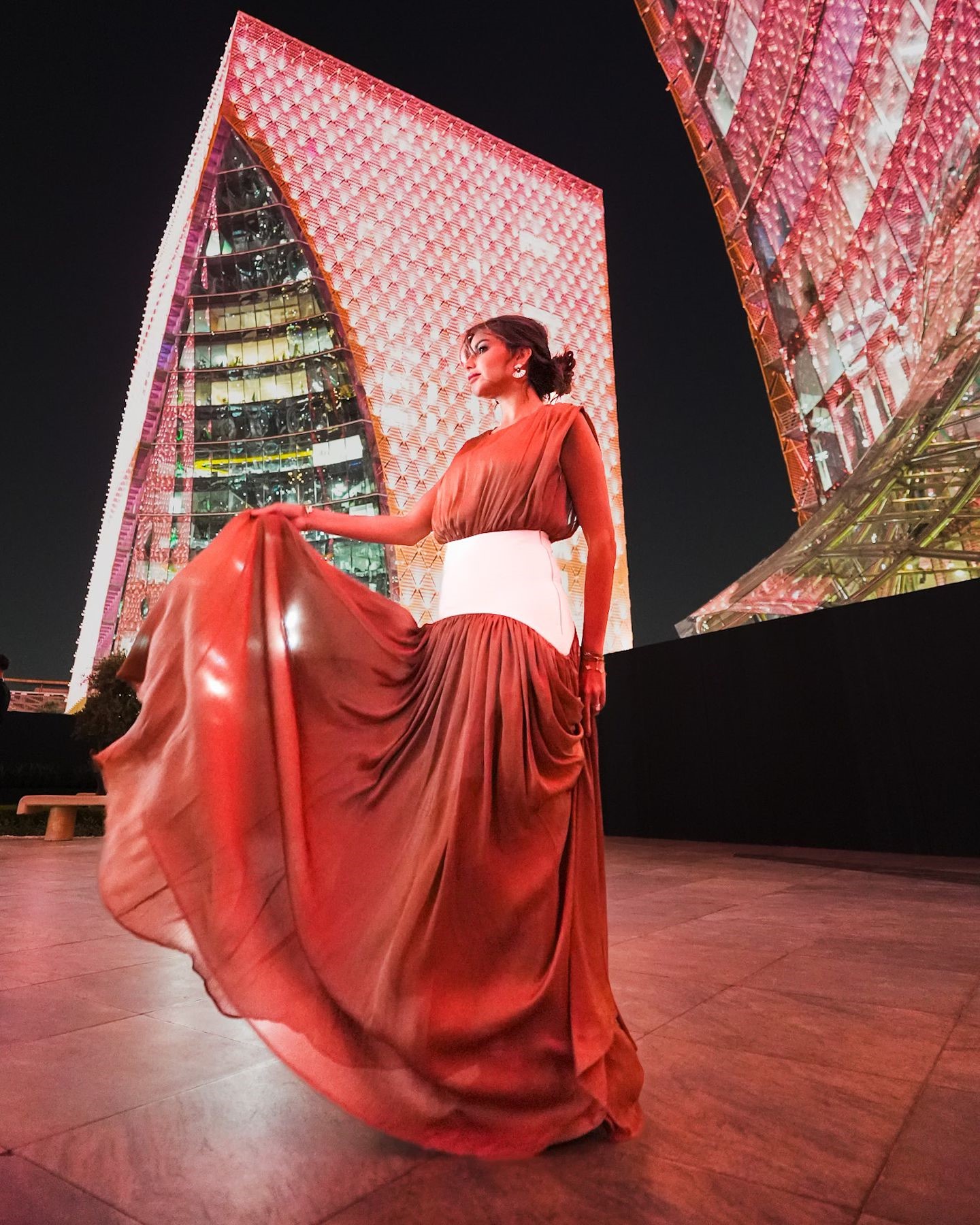 الإعلامية سارة مراد كانت من بين أبرز الحاضرات في عروض Abadia، حيث اختارت فستانًا حريريًا باللون القرميدي بتصميم فضفاض ومنسدل مع أكتاف عريضة وكورسيه بيج عريض عند الخصر.