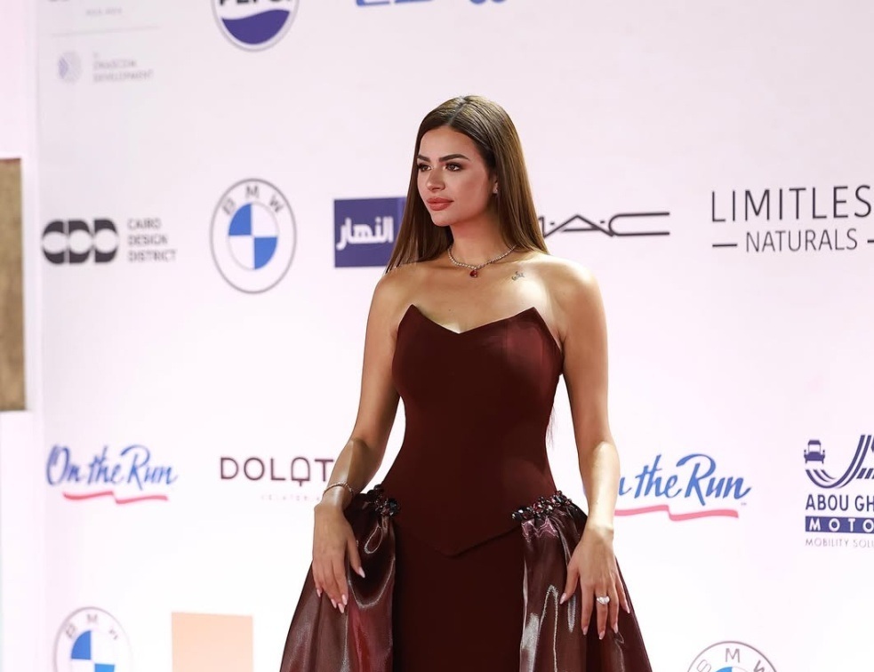 تألقت هنادي مهنا بفستان بني مجسم بقصة كورسيه وتنورة ماكسي، مزين بتطريز كريستالي وجوانب حريرية منسدلة بثنيات فخمة. اعتمدت الشعر المالس والمجوهرات الماسية لإكمال أناقتها.