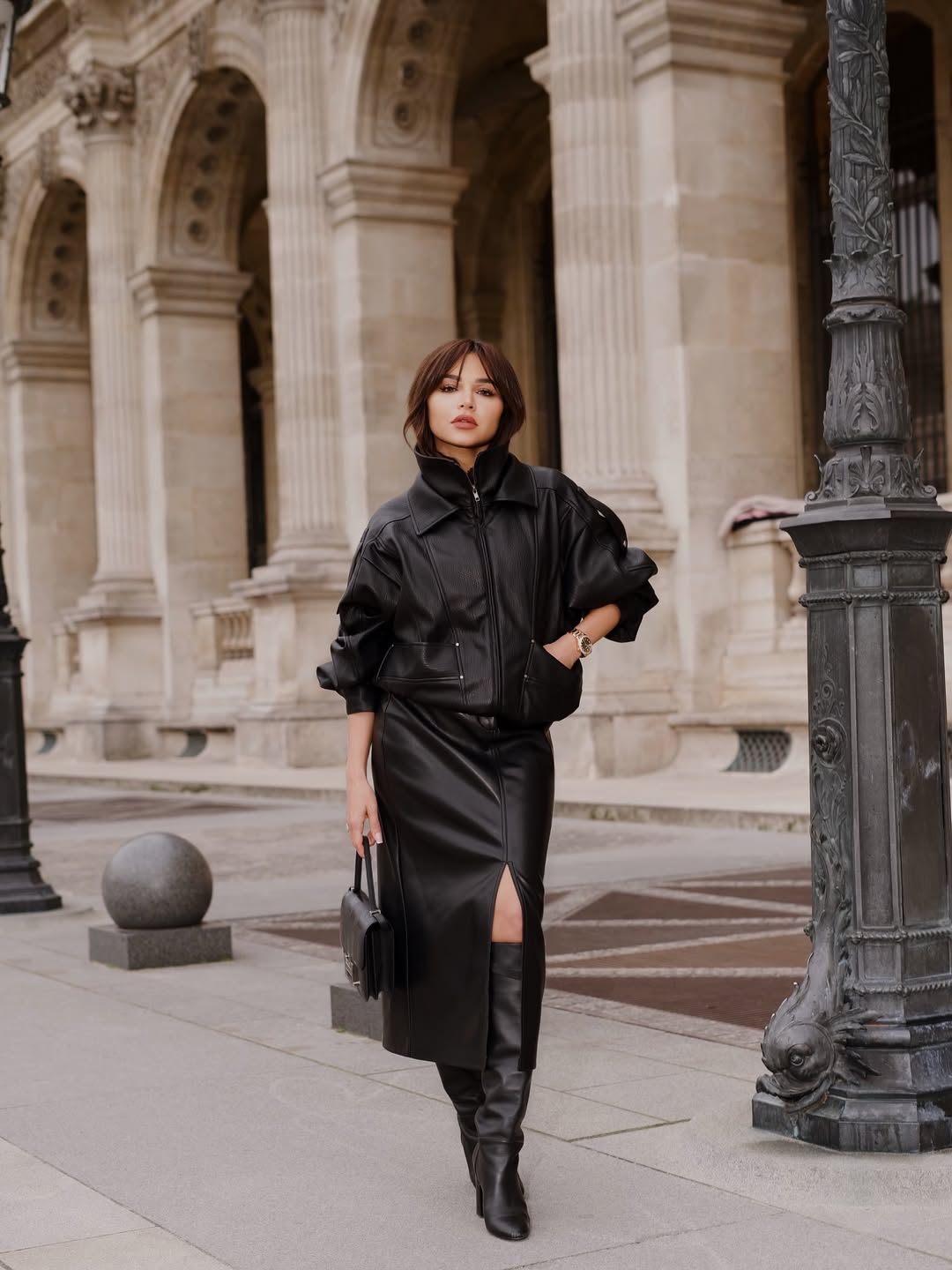 تنورة ميدي ضيقة بفتحة أمامية مع جاكيت منتفخ من الجلد الأسود، وبوت عالي وحقيبة متناغمة، مع لمسة الغرة الأمامية وخواتم مرصعة.