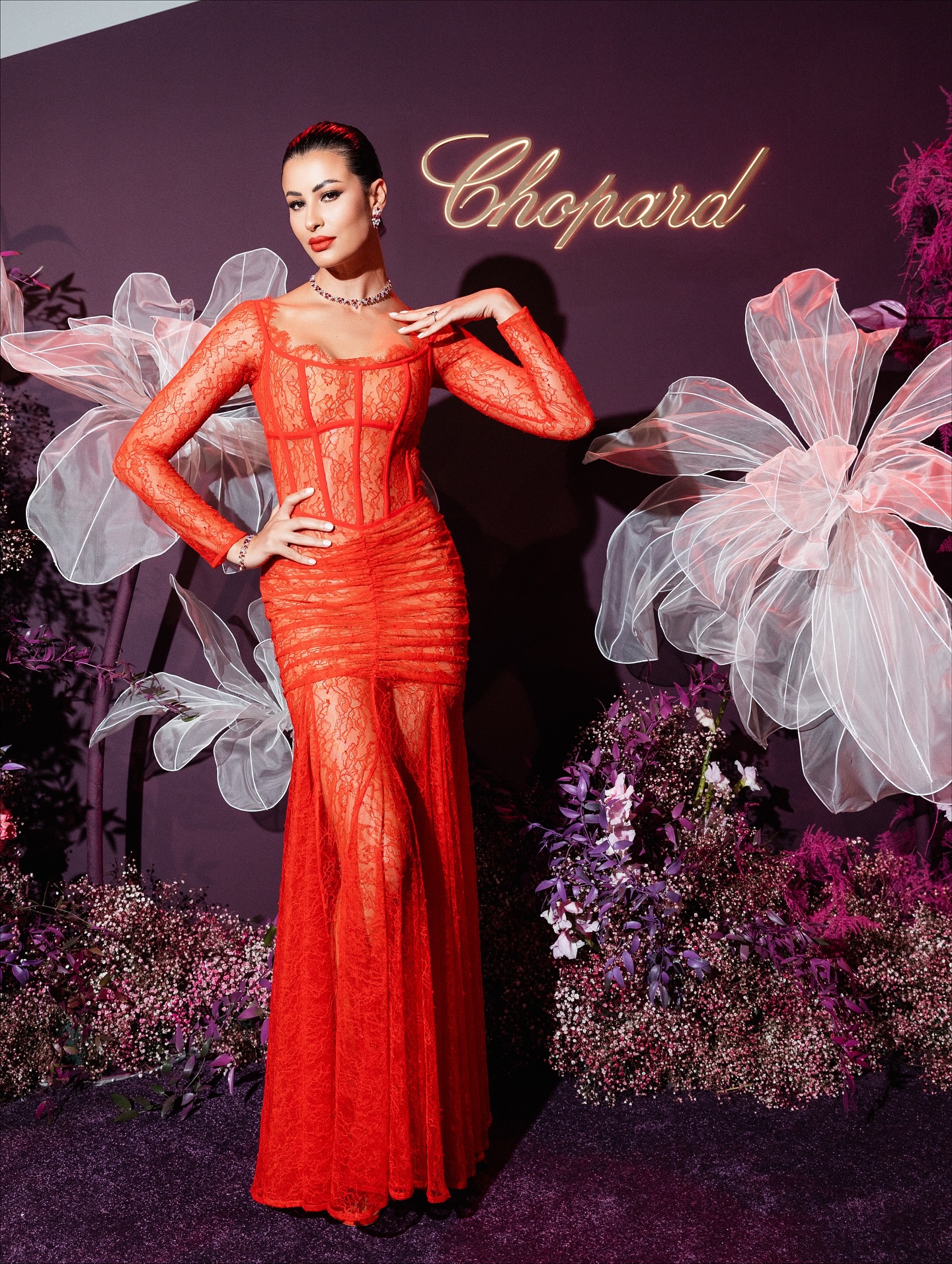 ريم سعيدي: فستان أحمر دانتيل شفاف، كورسيه بارز وأكمام طويلة شفافة، مزيج من الجرأة والرقي الكلاسيكي.