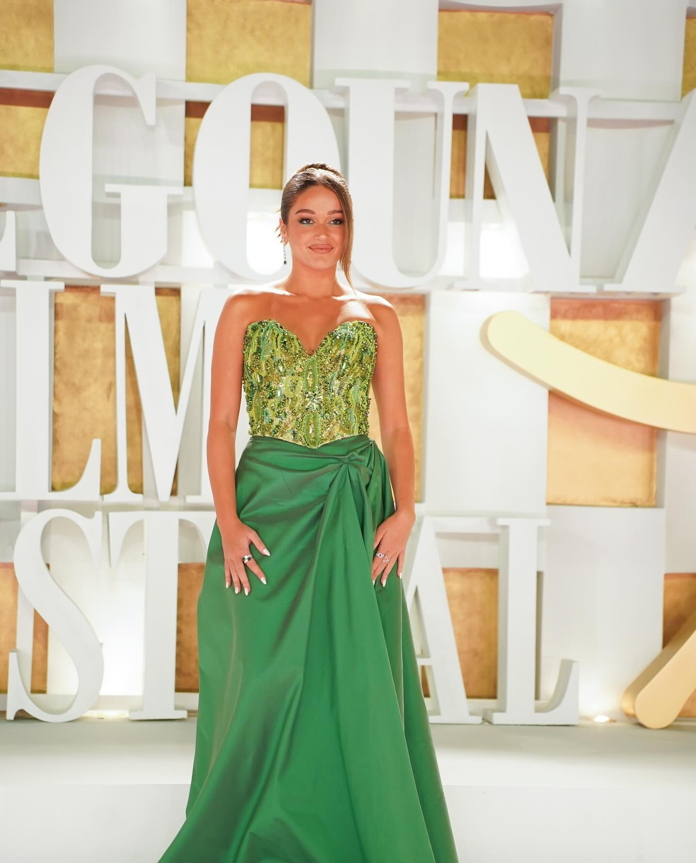 نور إيهاب: فستان أخضر من RAFIK ZAKI، كورسيه مطرز بالترتر والجزء السفلي من الساتان الناعم، لإطلالة متألقة.