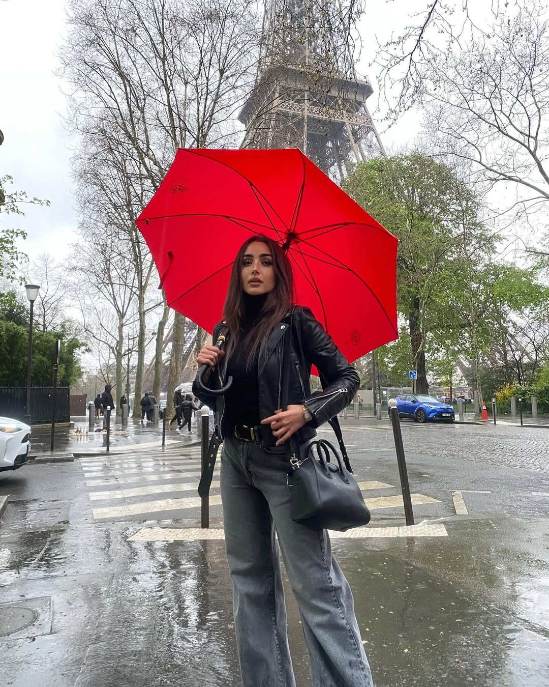 اختارت حقيبة جلد كتف بلون أسود كلاسيكي، وزيّنت الإطلالة بأقراط تحمل شعار Chanel. أما لمسة التميّز الحقيقية فجاءت من المظلة الحمراء اللافتة التي أضفت حيوية على المشهد دون مبالغة.