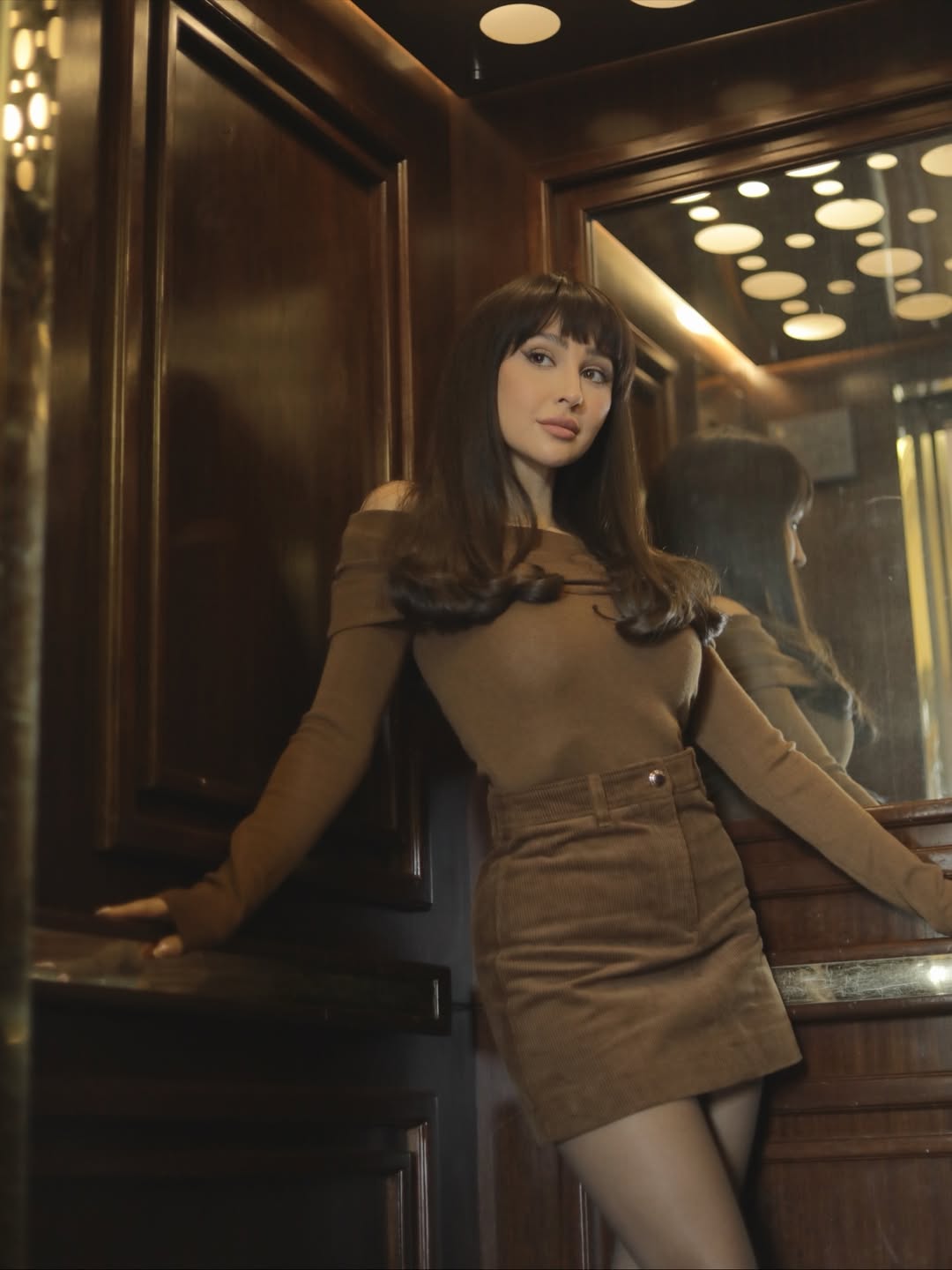 اختارت جيسي كنزة ناعمة مع تنورة قصيرة من المخمل المضلع، مع جوارب شفافة لإضفاء عمق ودفء للإطلالة الخريفية. أضافت الشعر الطويل مع غرة مستقيمة ولمسات مكياج ترابي هادئ لمظهر كلاسيكي راقٍ.