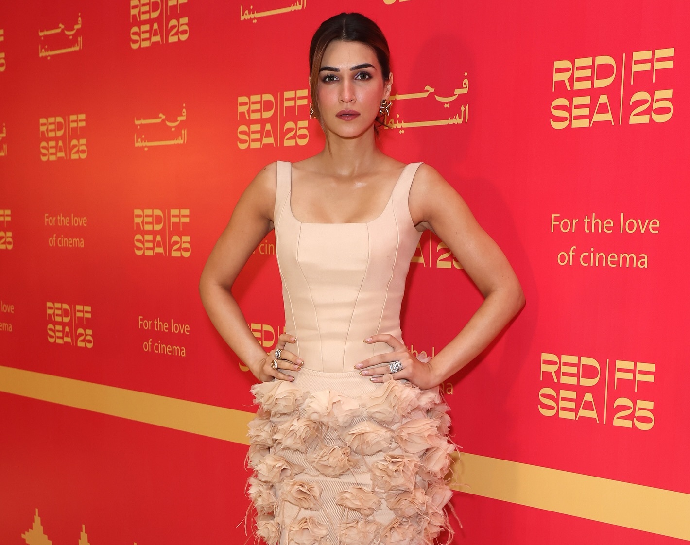 ابتعدت كريتي سانون عن البدل واختارت فستانًا نيود أنيقًا، تميز بتطريزات ثلاثية الأبعاد من الورود على التنورة الشفافة، ما منح التصميم بعدًا بصريًا غنيًا يجمع بين الرقة والفخامة.