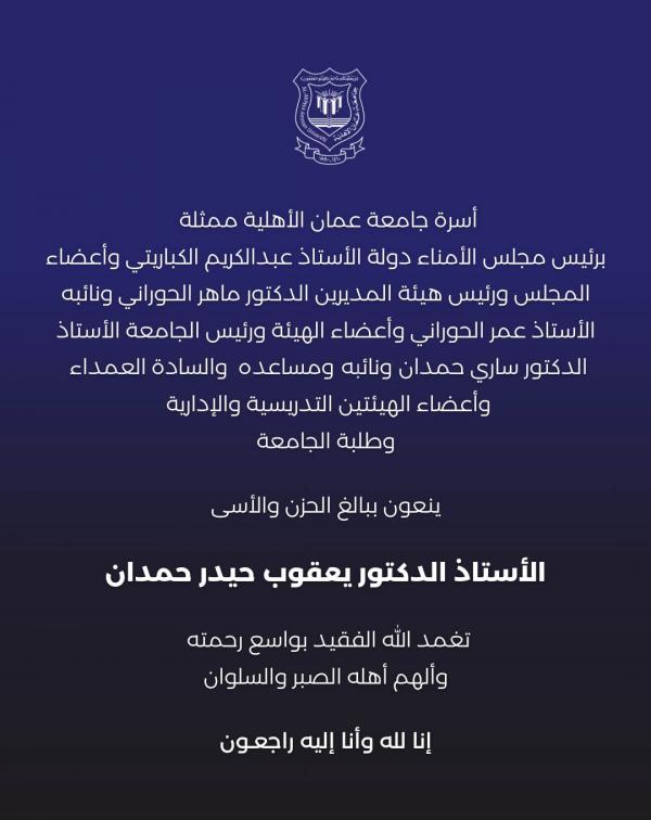 للعلّم - أسرة جامعة عمان الأهلية ممثلة برئيس مجلس الأمناء دولة الأستاذ عبد الكريم الكباريتي وأعضاء المجلس ورئيس هيئة المديرين الدكتور ماهر الحوراني ونائبه الأستاذ عمر الحوراني وأعضاء الهيئة ورئيس الجامعة الأستاذ الدكتور ساري حمدان ونائبه ومساعده والسادة العمداء وأعضاء الهيئتين التدريسية والإدارية وطلبة الجامعة ينعون ببالغ الحزن والأسى المرحوم الأستاذ الدكتور يعقوب حيدر حمدان.
