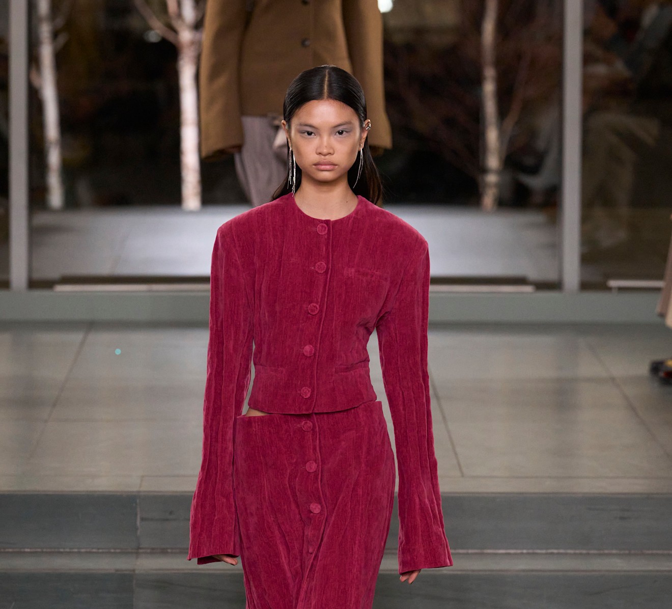لعبت الأقمشة دورًا محوريًا في إبراز هوية هذه الصيحة. فقد عاد التويد الكلاسيكي بقوة لدى Gucci، ليؤكد حضوره في الإطلالات الرسمية، فيما برز الجلد الناعم لدى Kallmeyer بأسلوب جريء يمنح البدلة طابعًا عصريًا وقويًا. أما Tory Burch، فاختارت الشامواه بلون زهري صارخ، مقدّمة خيارًا جريئًا لمحبات الألوان القوية والإطلالات اللافتة في الموسم البارد.