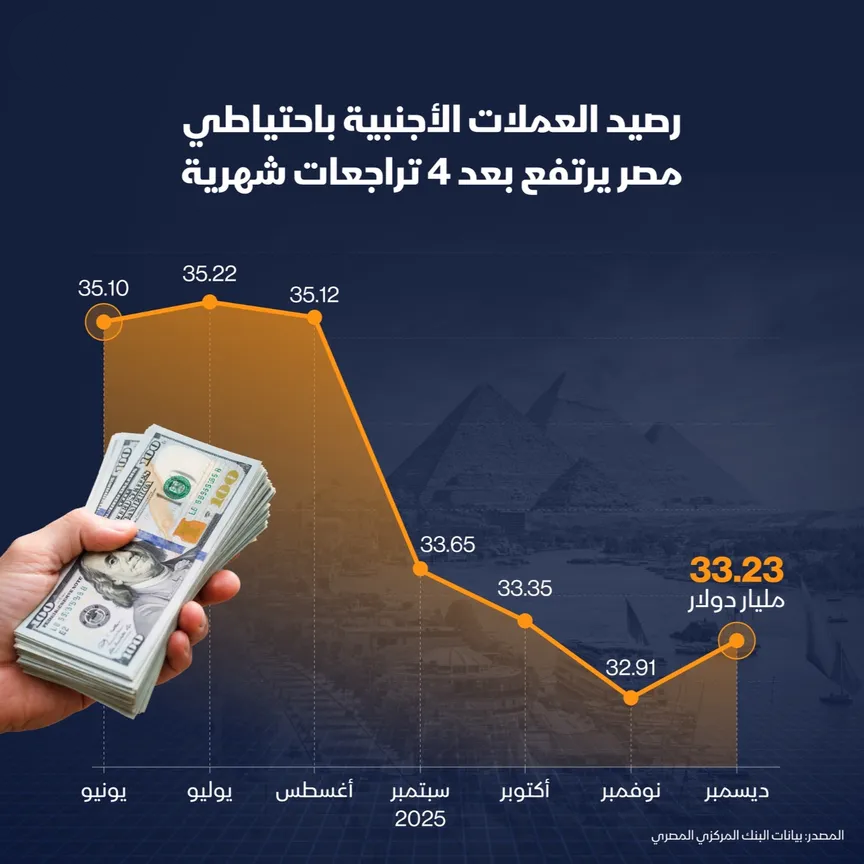 بلغت قيمة احتياطي مصر من العملات الأجنبية 33.2 مليار دولار في ديسمبر 2025، بعد أن تراجعت إلى 32.9 مليار دولار في نوفمبر.