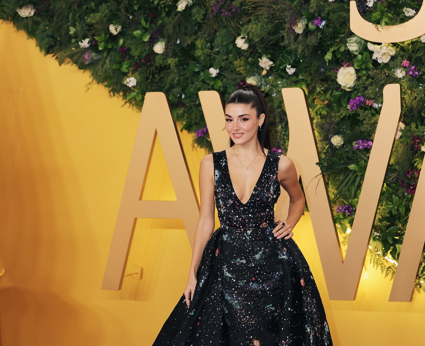 لفتت هاندا أرتشيل الأنظار بفستان أسود طويل بقصة واسعة، مرصع بتطريزات براقة متعددة الألوان تشبه النجوم. قصة الصدر العميقة والأكتاف المكشوفة أضافت جرأة أنيقة، دون أن تفقد الإطلالة فخامتها.