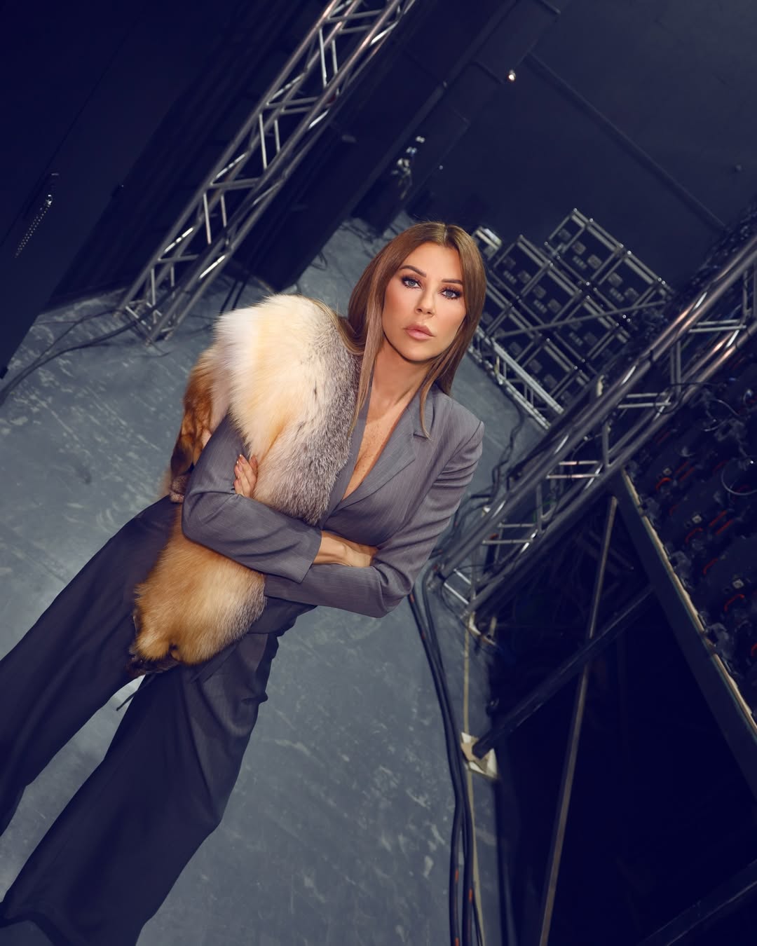 الإعلامية كارلا حداد اختارت بدلة رمادية مقلمة بقصة كلاسيكية، وأكملتها بوشاح من الفرو الطبيعي وضعته على الكتف، ما منح اللوك لمسة راقية من دون الحاجة إلى مجوهرات، مع اعتماد شعر منسدل وحذاء مدبب بطبعة جريئة.
