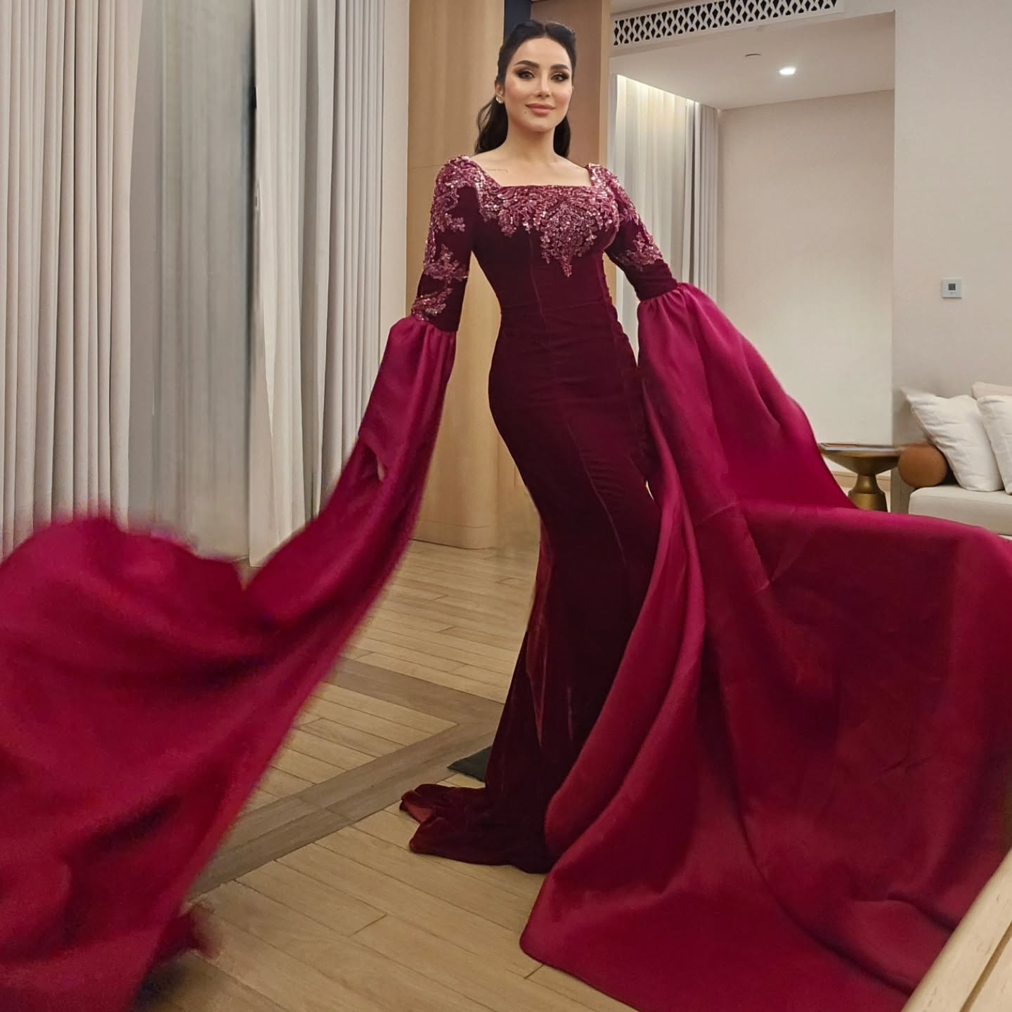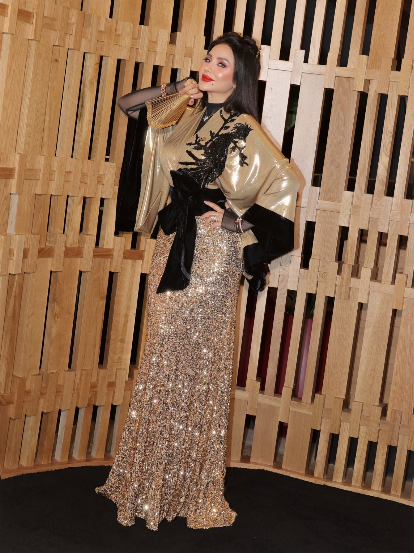 لجين قدّمت مثالًا على التنوع الذكي: فستان مخملي عنابي بتوقيع Charbel Karam بلمسة ملكية، ثم إطلالة أخرى بالترتر الذهبي مع تفاصيل سوداء. رسالتها واضحة: الوقار لا يعني التكرار.