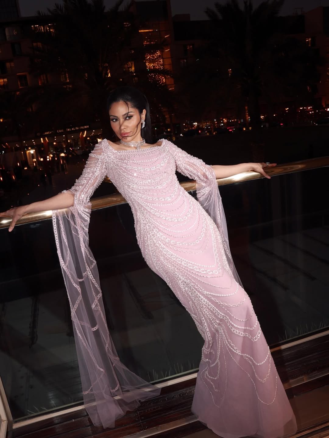 فستان زهري بأكمام طويلة من تصميم طوني ورد، مطرز باللؤلؤ، قدّم أناقة ناعمة تناسب الأذواق الكلاسيكية المعاصرة.