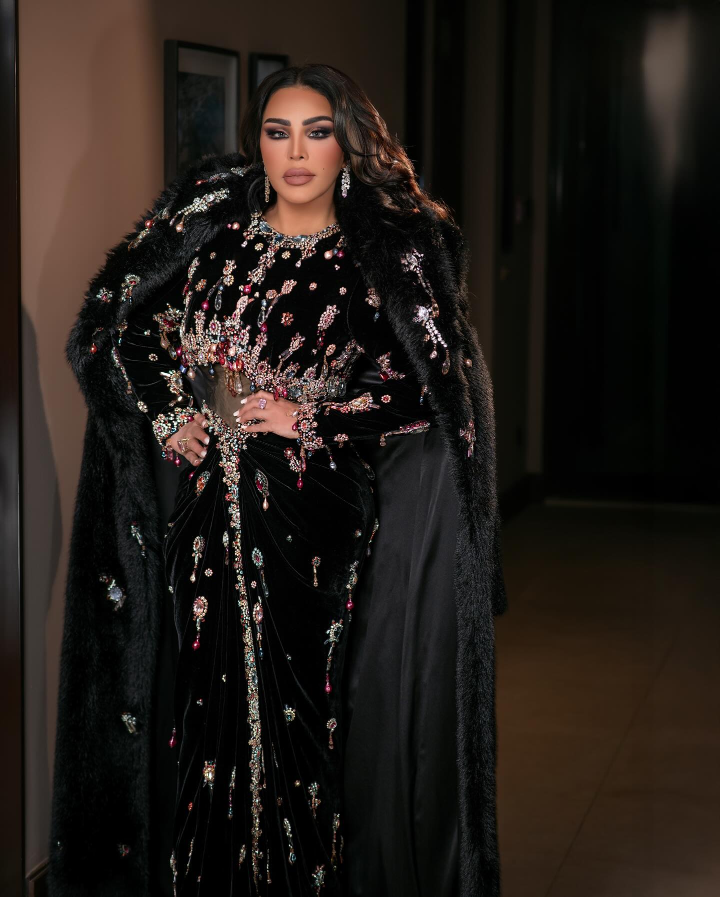 ثوب أسود طويل من المخمل بتوقيع رامي قاضي، مع ياقة عالية وشوكر مرصع، إطلالة تؤكد أن القوة أحيانًا تكون في التفاصيل الصامتة.