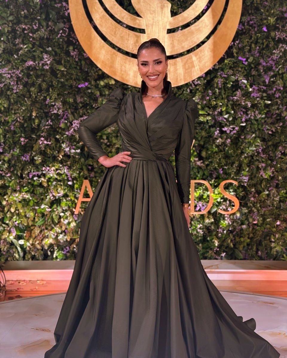 إطلالة حنان مطاوع باللون الزيتي الداكن، من تصميم نور فتح الله، أكدت أن البساطة ليست خيارًا آمنًا فقط، بل خيارًا أنيقًا أيضًا. تصميم بأكمام طويلة وتنورة منسدلة، مثالي لسهرات رمضان بلا أي مجهود إضافي.