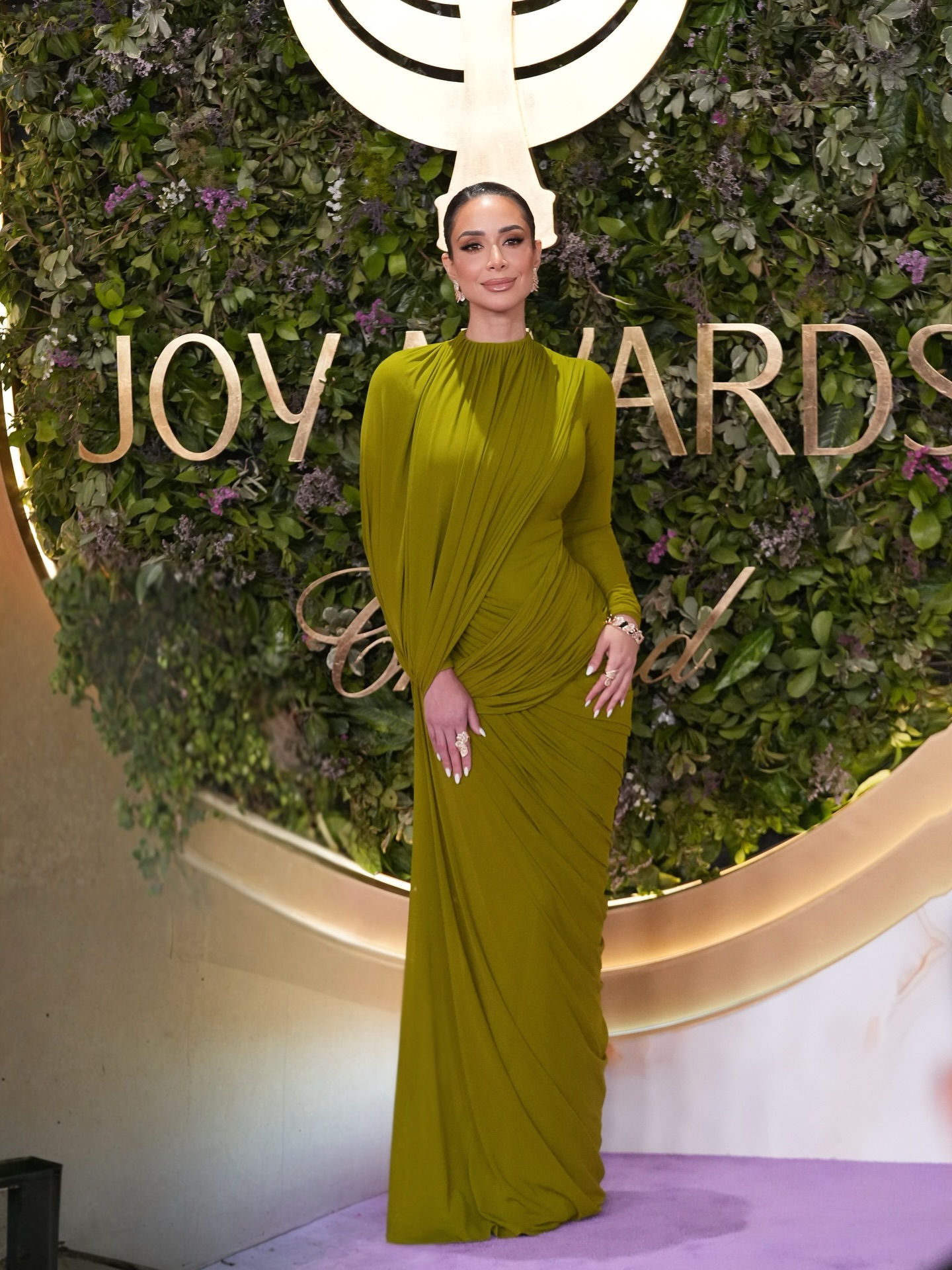 فستان زيتوني مائل للذهبي من Deme by Gabriella، بأكمام طويلة وقصة ملتفة عند الخصر، قدّم إطلالة مثالية لمن تبحث عن الأناقة بلا تعقيد.