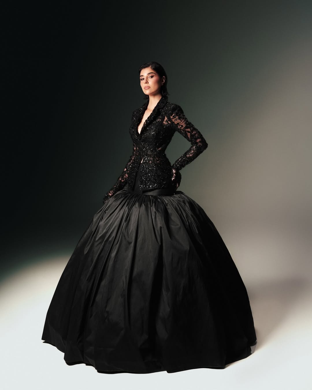 إطلالة سوداء من توقيع جان لويس صبجي جمعت بين الحرير والتل المطرز، لتقدم فخامة هادئة تناسب المناسبات الكبرى.