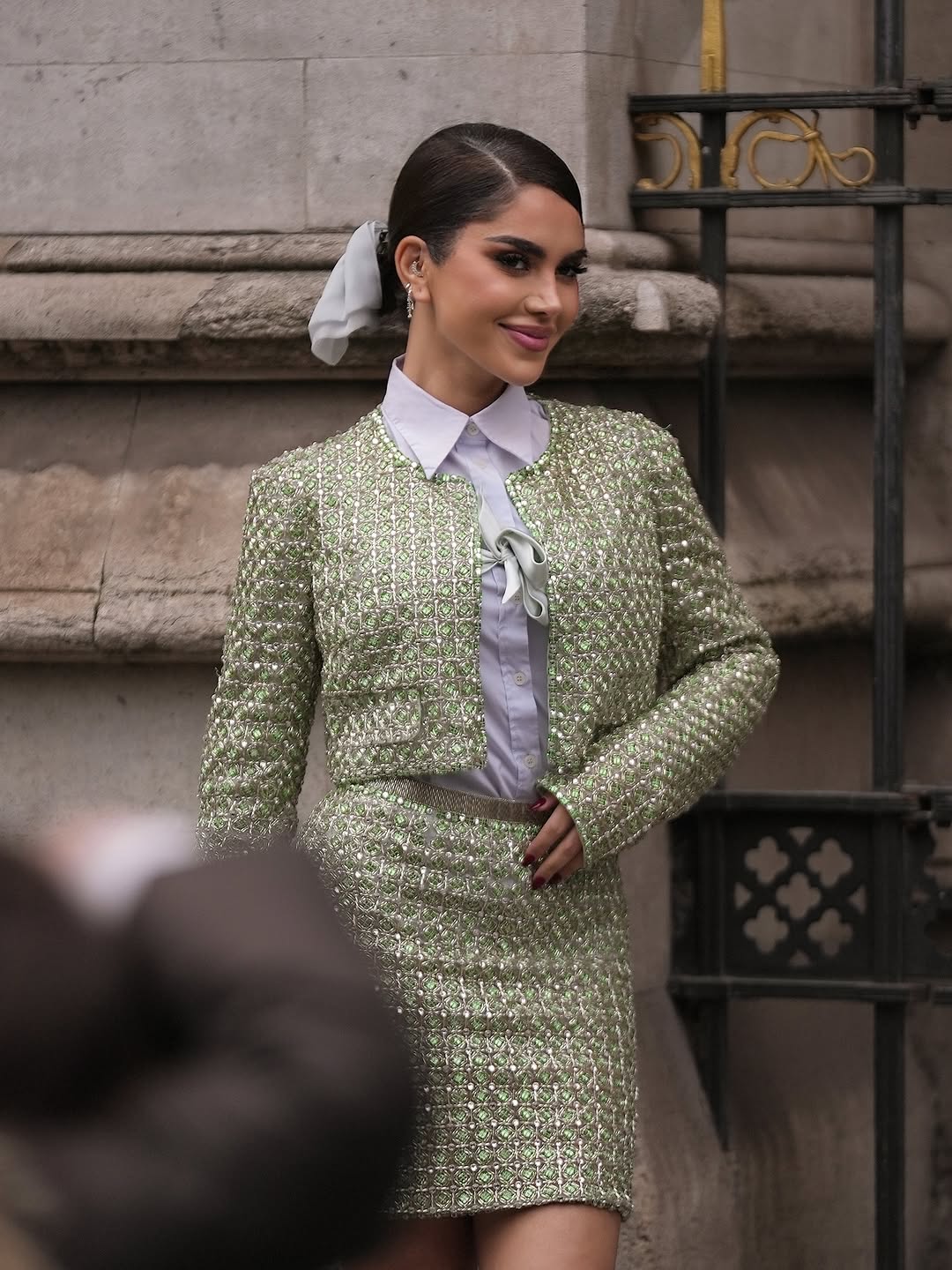 رائدة الأعمال السعودية نجود الرميحي اختارت طقمًا كلاسيكيًا من جاكيت قصير وتنورة ضيقة بدرجات الأخضر الفاتح، مع قميص أبيض بياقة كلاسيكية، وحذاء أسود بكعب عالٍ.