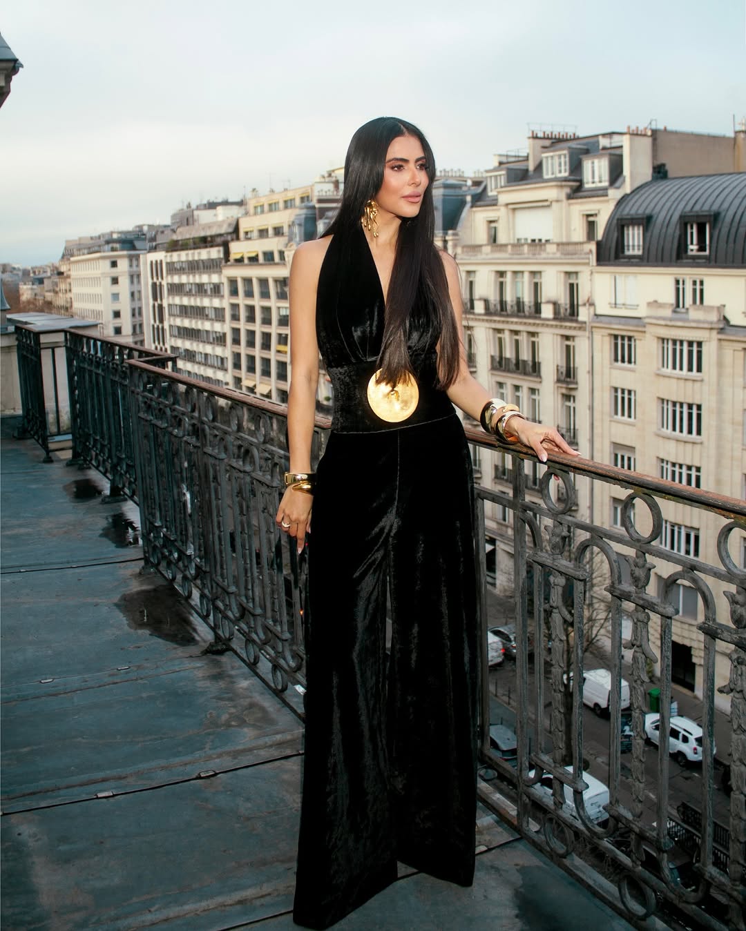 في عرض سكياباريلي، اختارت ندى باعشن جمبسوت أسود من المخمل، بياقة مفتوحة وحزام ذهبي عريض عند الخصر، مع إكسسوارات ذهبية، لتجمع بين الأنوثة والقوة، بأسلوب يحاكي هوية الدار الجريئة.