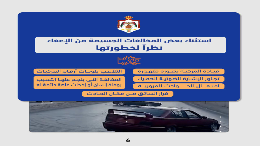 للعلّم - قرَّر مجلس الوزراء في جلسته التي عقدها الثُّلاثاء، برئاسة رئيس الوزراء جعفر حسان، منح خصومات على قيم المخالفات المروريَّة المستحقَّة على المخالفين قبل تاريخ 17 شباط 2026م.