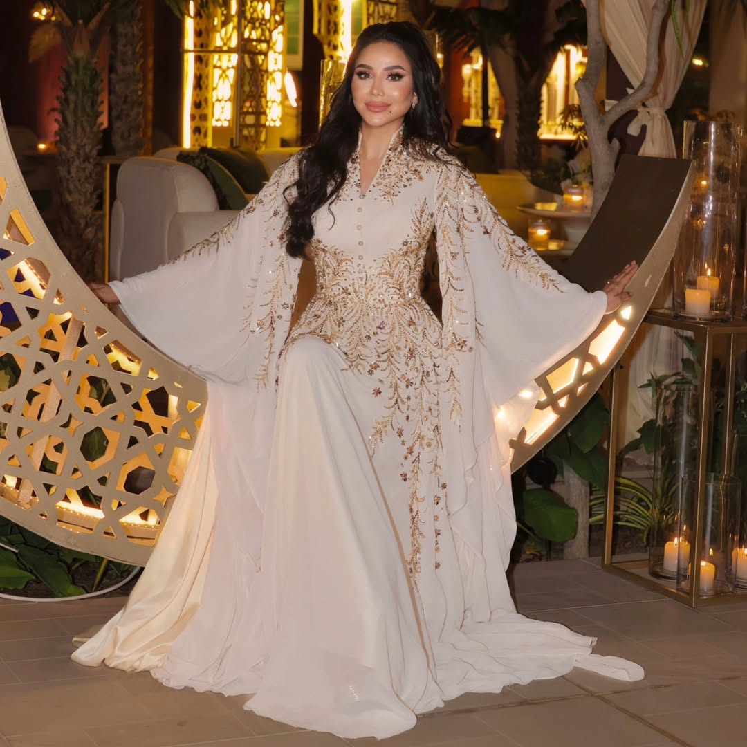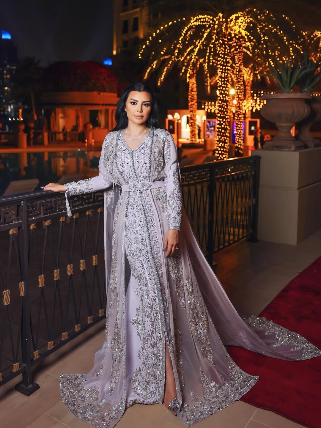 أصيل هميم خطفت الأنظار بقفطان بتدرج بنفسجي فاتح من تصميم ريم الجسمي، بقصة حورية مطرزة بالكامل مع كاب شفاف وشراشيب كريستالية منسدلة بفخامة لافتة.