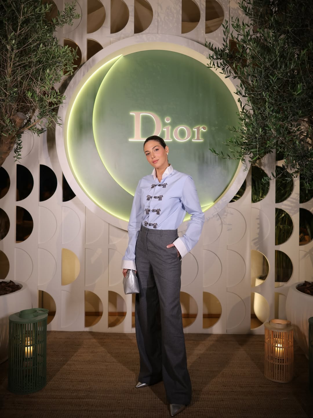 رزان جمال اختارت البنطال الرمادي الواسع بخصر عالٍ مع قميص أزرق فاتح مزين بتطريزات ناعمة. أكملت الإطلالة بحذاء وكلاتش فضيين، وتسريحة كعكة عالية مع أقراط لؤلؤية منحتها هدوءاً ملكياً.