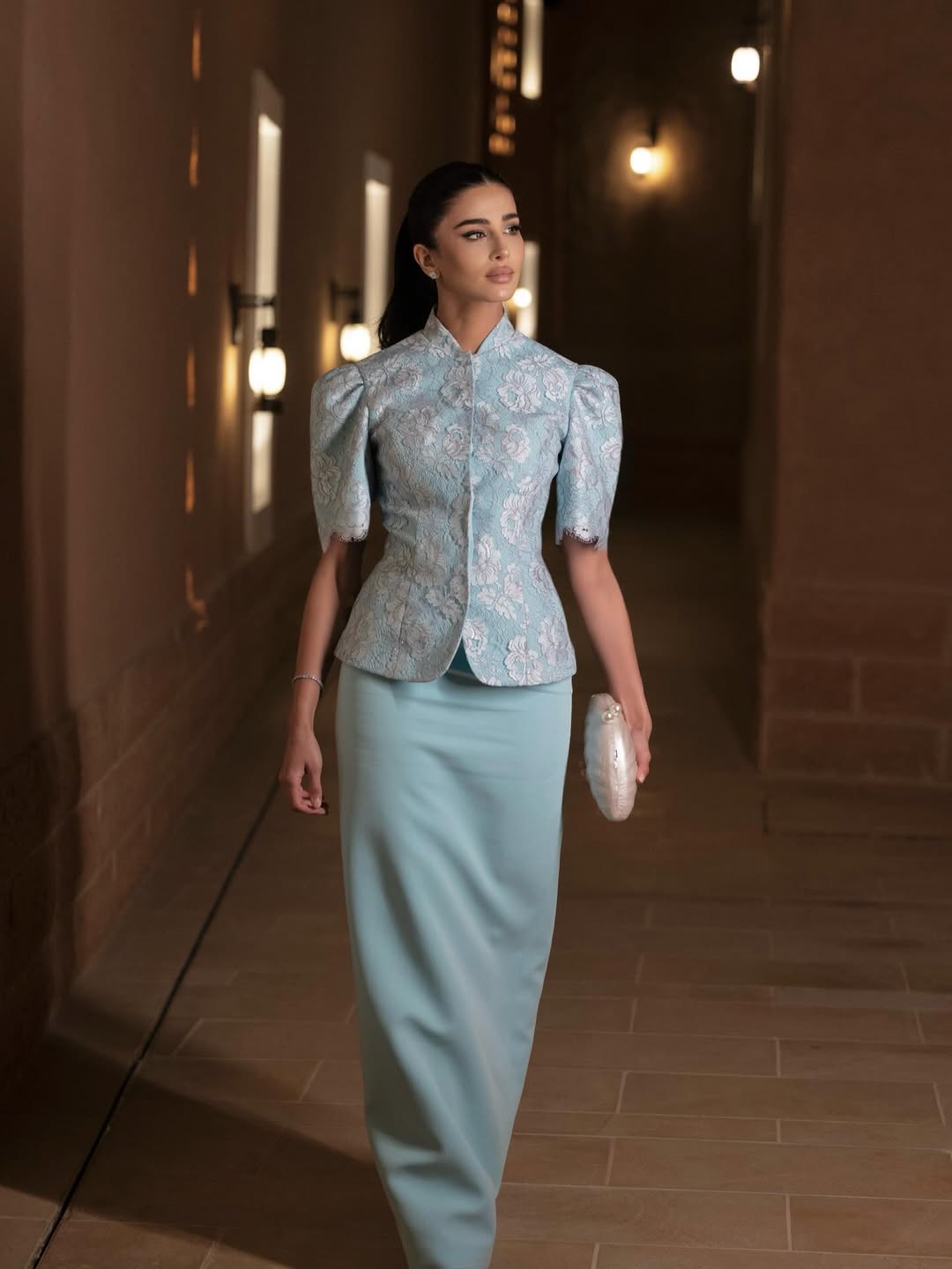 رهف الحربي اعتمدت طقماً أزرق باستيل من تنورة ماكسي مستقيمة وتوب دانتيل مطرز بأكمام منفوخة، ونسقته مع كلاتش لؤلؤية وتسريحة ذيل حصان مموج.