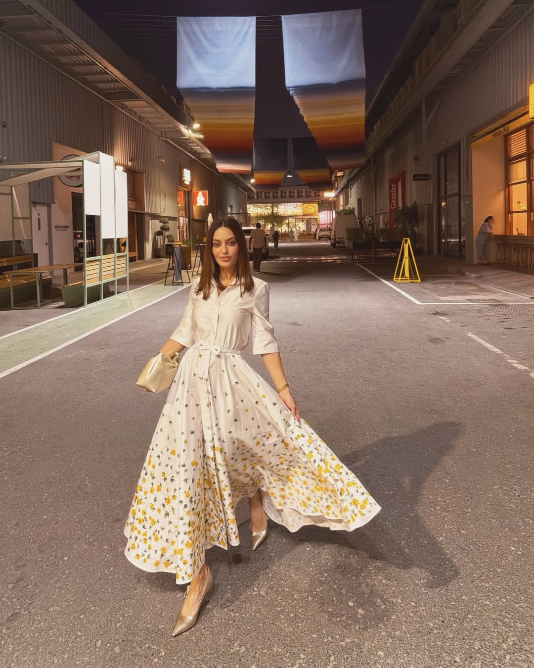 كارن وازن تألقت بفستان ميدي أبيض بقصة قميص، مزين بطبعات ورود صفراء وثنيات واسعة، ونسقته مع حذاء وكلاتش ذهبيين. شعرها المالس المنسدل أضفى لمسة رومانسية ناعمة.