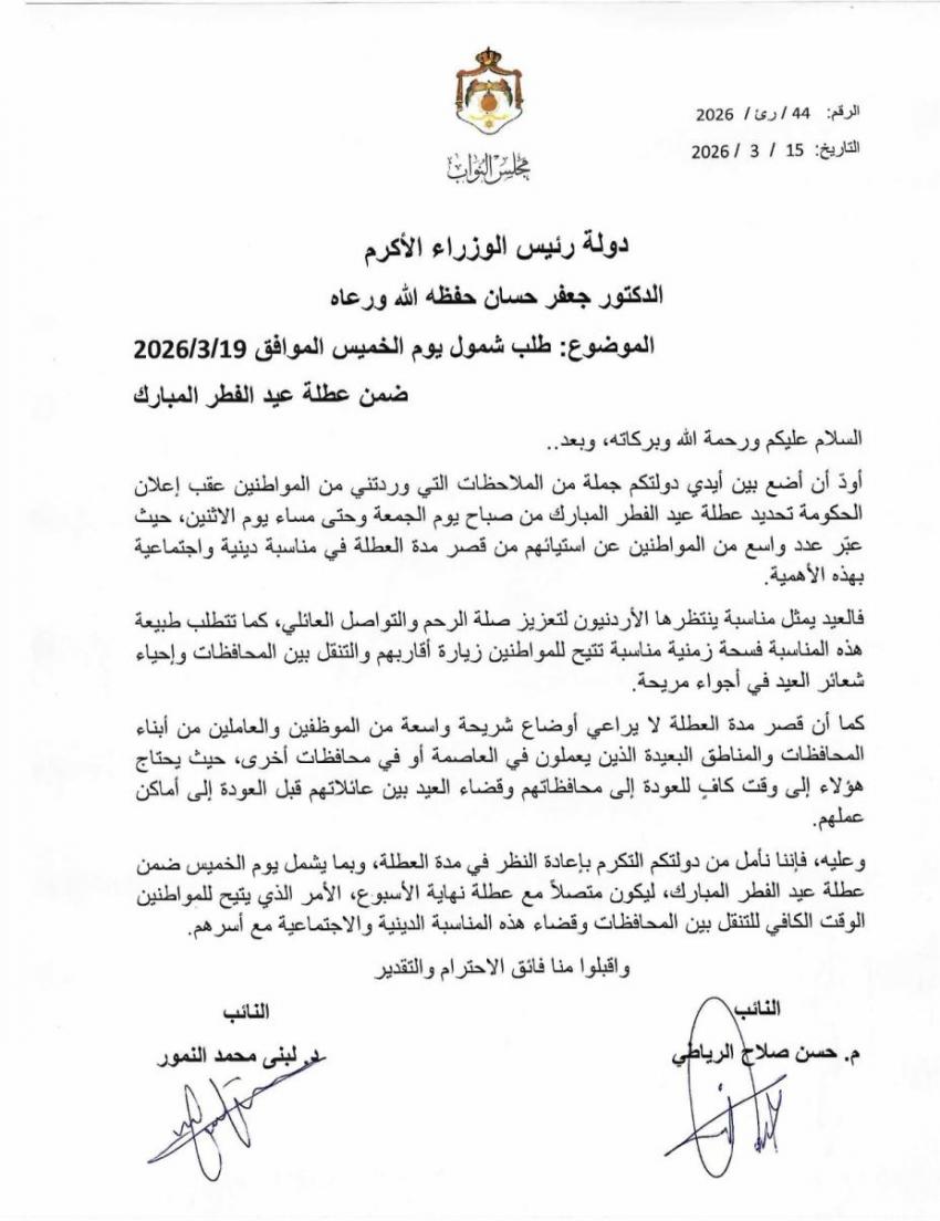 للعلّم - طالب النائبان حسن صلاح الرياطي ولبنى محمد النمور رئيس الوزراء جعفر حسان بإعادة النظر في مدة عطلة عيد الفطر المبارك، لتشمل يوم الخميس الموافق 19 آذار 2026، بما يتيح وصل العطلة مع نهاية الأسبوع.