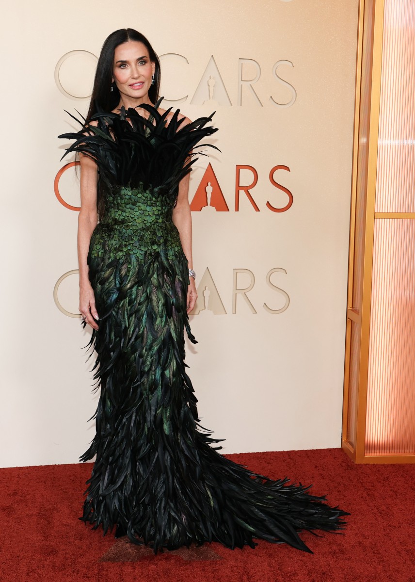 ديمي مور أبهرت الأعين بإطلالة درامية بصيحة الريش من تصميم دار Gucci، حيث ارتدت فستانًا سترابلس، مزينًا ببتلات متراصة تنحت الخصر، وتلفت النظر بلونها الأخضر الزمردي اللامع، بينما غطت شعيرات الريش المتطايرة باللون الأسود منطقة الصدر، كما لفت قوامها بداية من أسفل الخصر، امتدادًا على شكل ذيل الحورية الذي انسدل خلفها على السجادة الحمراء. وتزينت ديمي مور بأقراط مرصعة وسوار ماسي سميك لتكتمل أناقتها، مع ترك شعرها المالس منسدلاً.