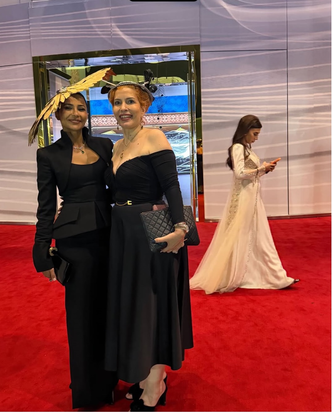 تألقت رؤى الصبان بفستان طويل باللون البرغندي يبرز القوام، مع أكمام بتصميم كاب قصير ملتف حول الذراعين وياقة عالية. وزُيّن الخصر بثنيات متدلية، فيما حملت كلاتش أسود مزيناً بالشراشيب، واختارت قبعة بتصميم ريش ثلاثي الأبعاد، مع شعر مموج منسدل.