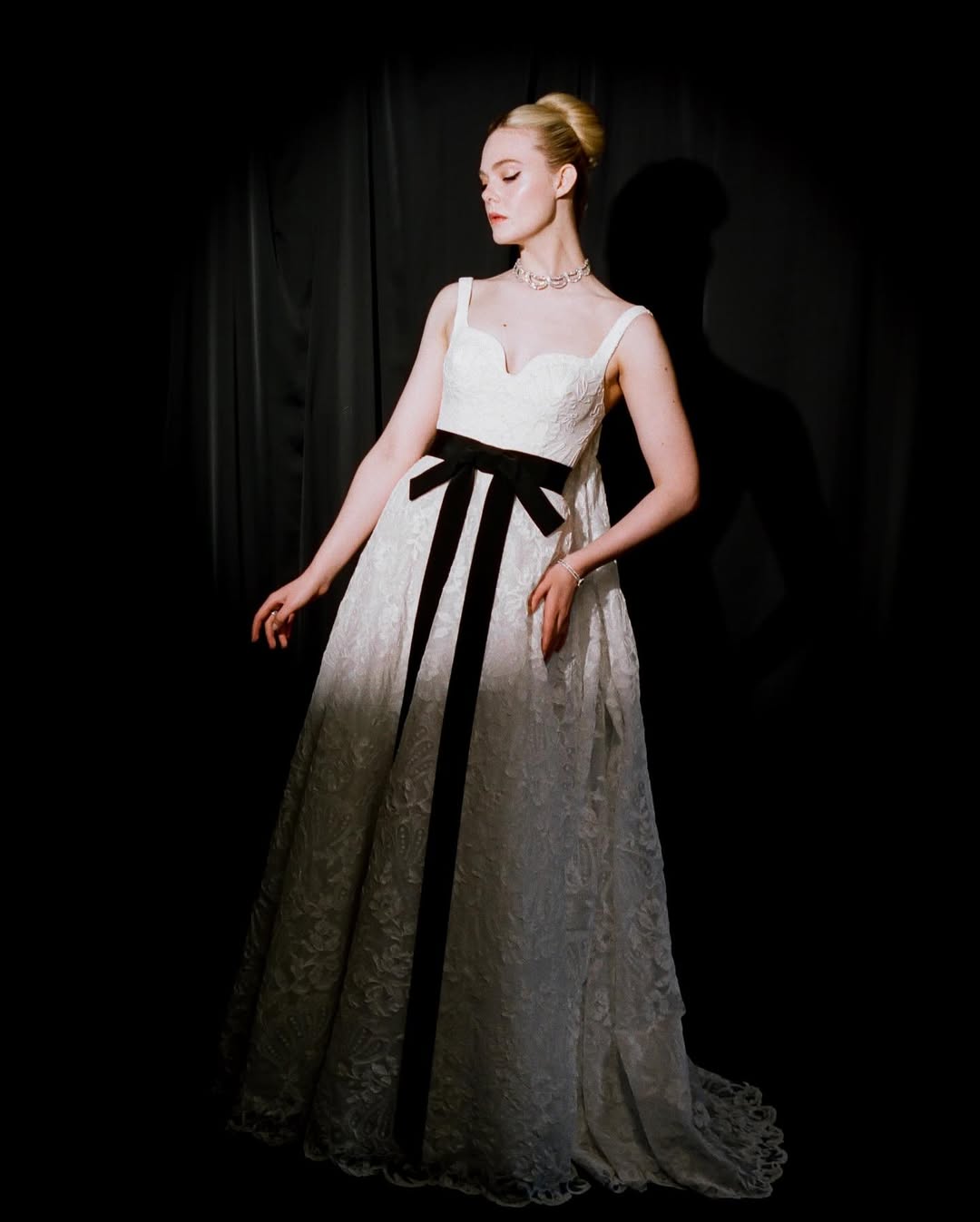 وفي إطلالة أخرى تحمل روح الأناقة الكلاسيكية، ارتدت فانينغ فستاناً من الدانتيل الأبيض من توقيع Givenchy، مستوحى من أحد تصاميم الدار عام 1952. تميز الفستان بقصة منتفخة وخصر محدد بحزام أسود تتوسطه فيونكة طويلة، مع وشاح منسدل خلف الظهر يمنح التصميم فخامة ملكية، واكتملت الإطلالة بمجوهرات ماسية من Cartier.