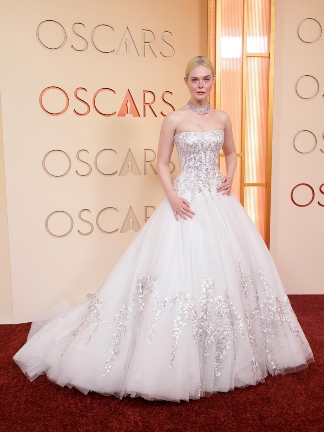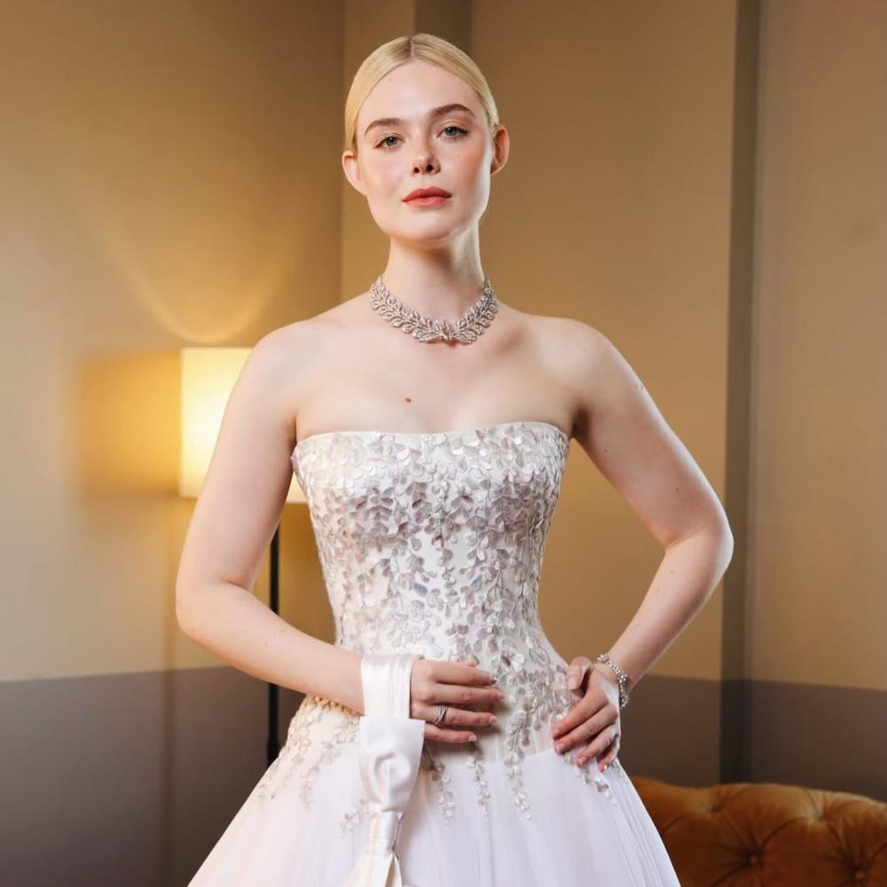 تعرف إيل فانينغ بشغفها بالفساتين المنفوشة ذات الطابع الرومانسي، وهو ما بدا واضحاً في ظهورها خلال حفل حفل الأوسكار 2026، حيث تألقت بفستان أبيض رقيق من تصميم Givenchy. جاء الفستان بكورسيه مكشوف الكتفين مزين بتطريزات الورود الفضية، مع تنورة منتفخة أضفت على الإطلالة لمسة أميرية. وأكملت النجمة طلتها بعقد فاخر من Cartier، وتسريحة شعر مرفوعة بكعكة منخفضة، مع حقيبة صغيرة مزينة بتفاصيل مشابهة للفستان.
