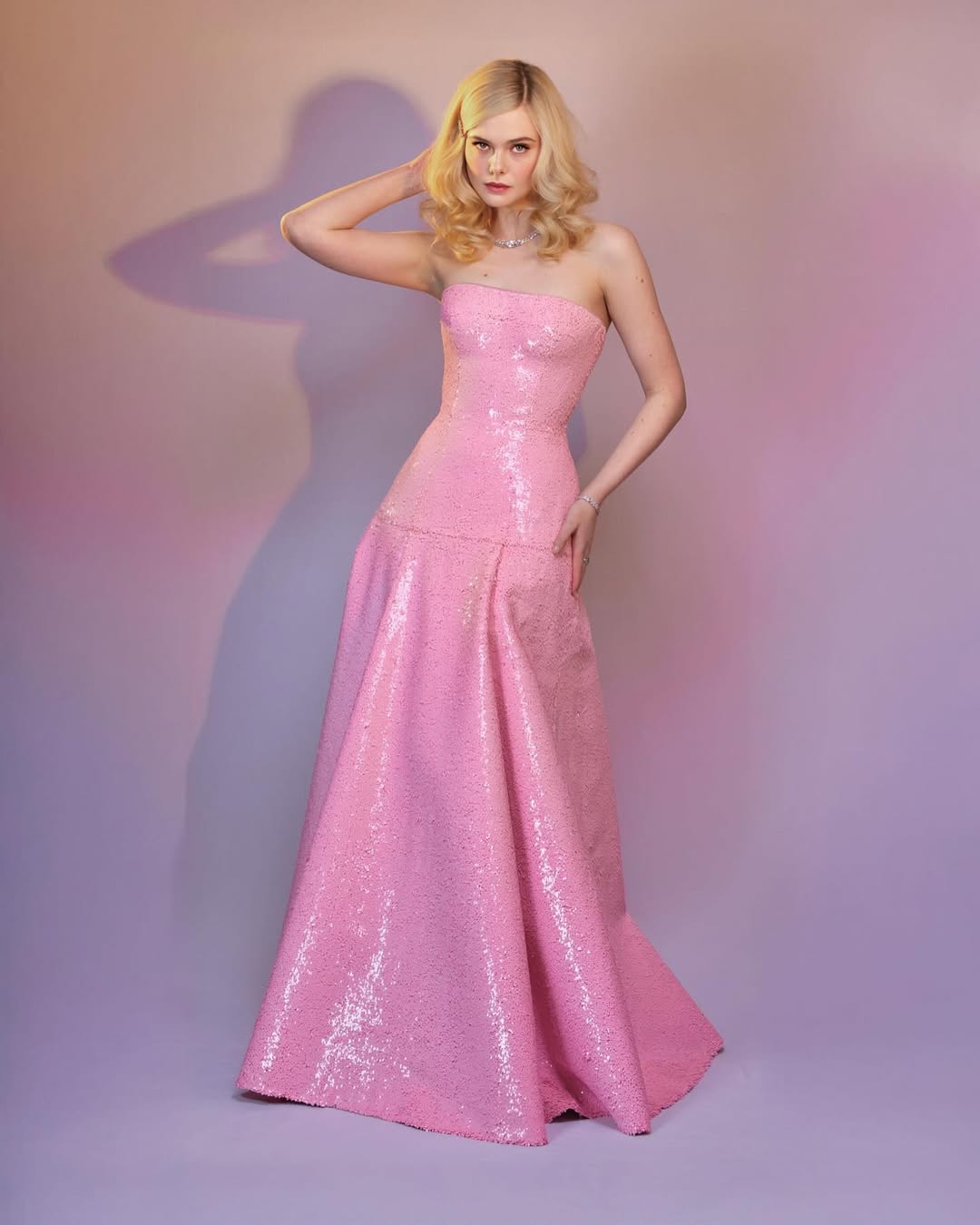 ومن الإطلالات اللافتة أيضاً فستان زهري طويل من تصميم Gucci، جاء بقصة خصر منخفض وأكتاف مكشوفة مع تنورة واسعة مزينة بتطريزات لامعة. وأكملت الإطلالة بمجوهرات ماسية وتسريحة شعر مموجة مع أكسسوار فضي رقيق.