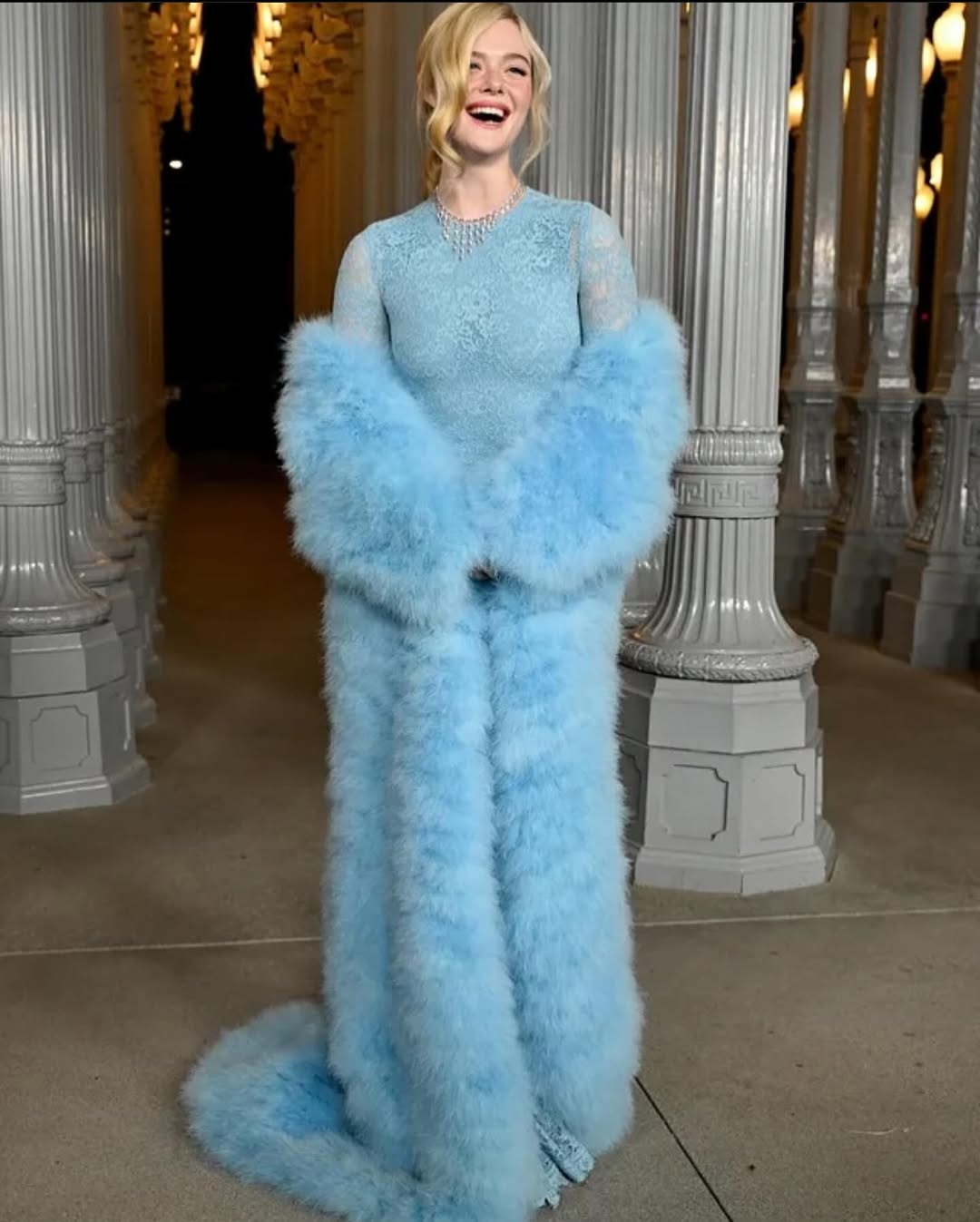 وفي ظهور آخر من الدار نفسها، اختارت فستاناً من الدانتيل الأزرق الباستيل بقصة مجسمة وأكمام طويلة وياقة مرتفعة، ونسقته مع معطف فرو أوفرسايز باللون ذاته، أسدلته برقة على كتفيها لتضفي على الإطلالة طابعاً درامياً فاخراً.