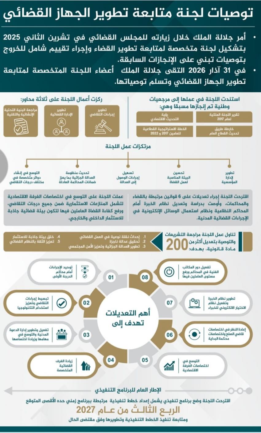 واقترحت اللجنة إجراء تعديلات على 6 قوانين مرتبطة بالقضاء والمحاكمات وأوصت بدراسة وتعديل نظام الخبرة أمام المحاكم النظامية ونظام استعمال الوسائل الإلكترونية في الإجراءات القضائية المدنية.