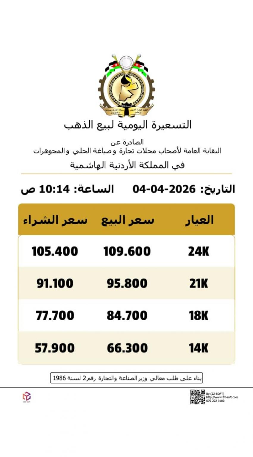 وبلغ سعر الغرام الواحد من الذهب عيارات 24 و18 و14 لغايات البيع من محلات الصاغة عند 109.60 دينارا 84.70 دينارا 66.30 دينارا على التوالي.