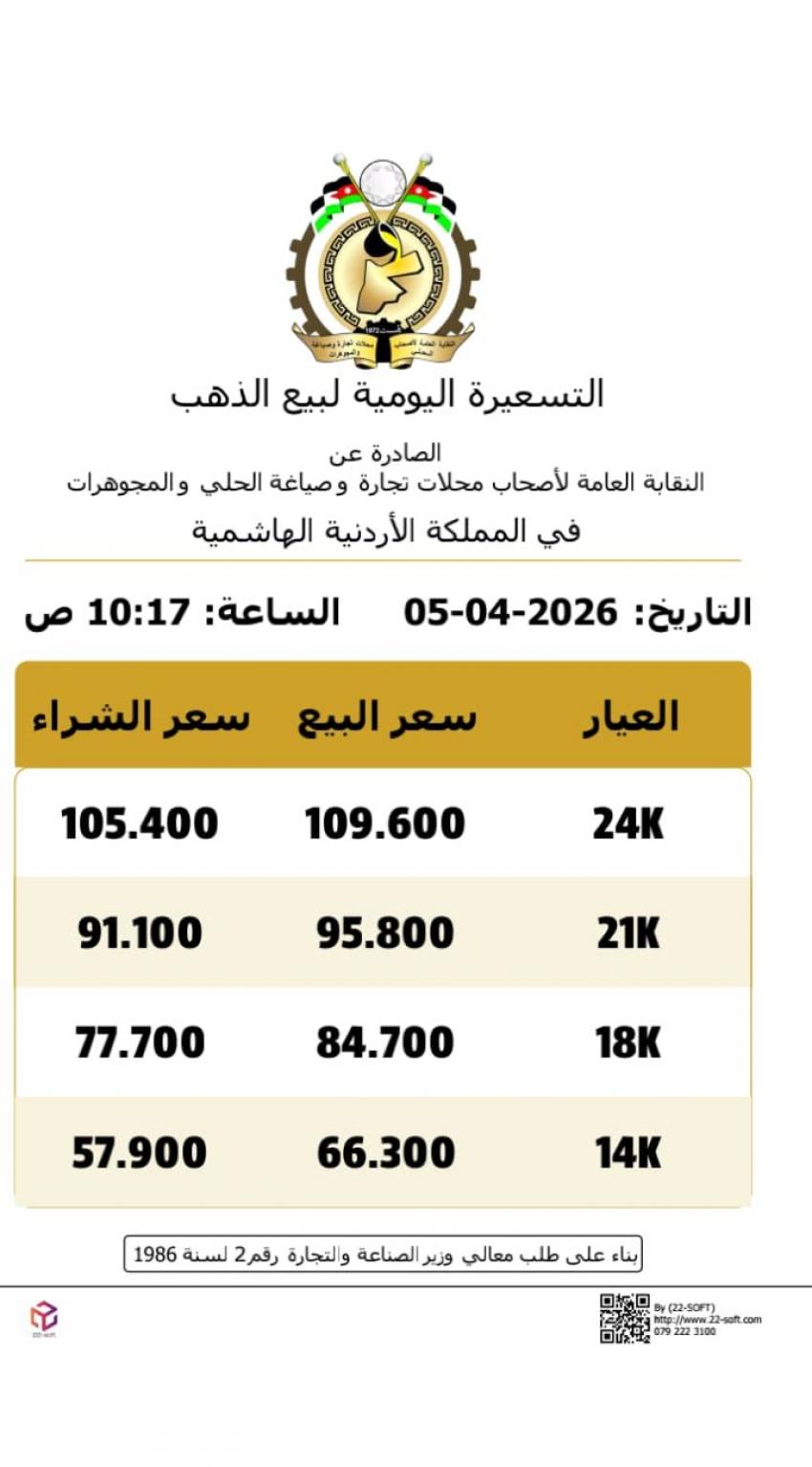 وبلغ سعر الغرام الواحد من الذهب عيارات 24 و18 و14 لغايات البيع من محلات الصاغة عند 109.60 دينارا 84.70 دينارا 66.30 دينارا على التوالي.