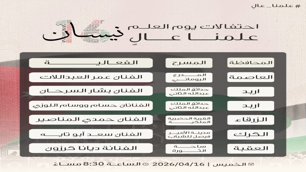 وبين الرواشدة أنه سيتم رفع العلم في جميع المحافظات عند الساعة الثانية عشرة ظهرًا، بتنظيم من وزارة الداخلية، ومشاركة موسيقات القوات المسلحة الأردنية – الجيش العربي، إلى جانب مؤسسات رسمية وفعاليات شعبية وفرق كشفية.