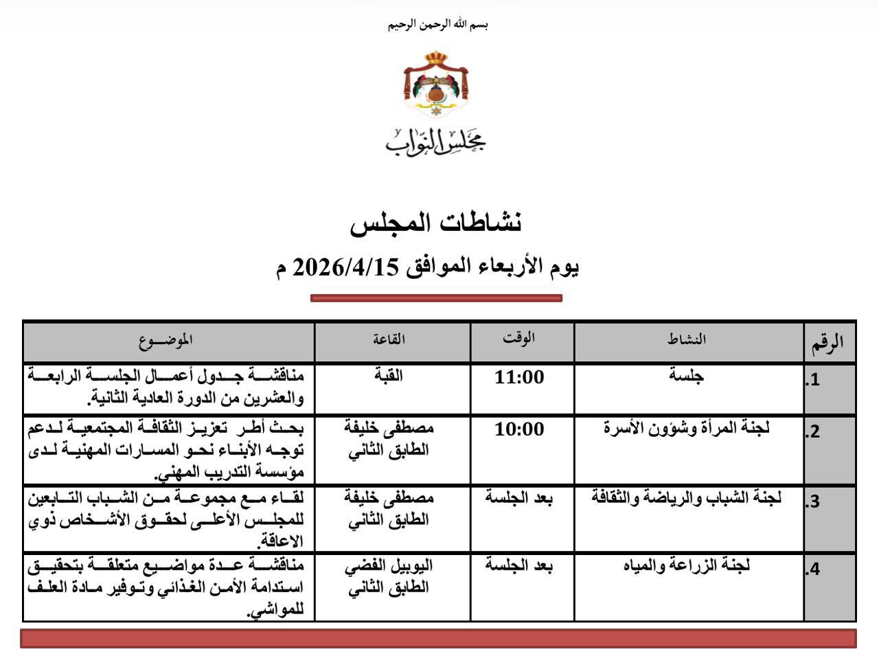 وتبحث لجنة المرأة وشؤون الأسرة، أطر تعزيز الثقافة المجتمعية لدعم توجه الأبناء نحو المسارات المهنية لدى مؤسسة التدريب المهني، بينما تلتقي لجنة الشباب والرياضة والثقافة مجموعة من الشباب التابعين للمجلس الأعلى لحقوق الأشخاص ذوي الإعاقة.