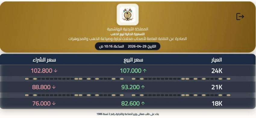 ووفق التسعيرة اليومية الصادرة عن النقابة العامة لاصحاب محال صياغة وتجارة الحلي والمجوهرات، بلغ سعر الغرام الواحد من الذهب عيارات 24 و18 لغايات البيع من محالّ الصاغة 107 دنانير 82.6 دينارا على التوالي.