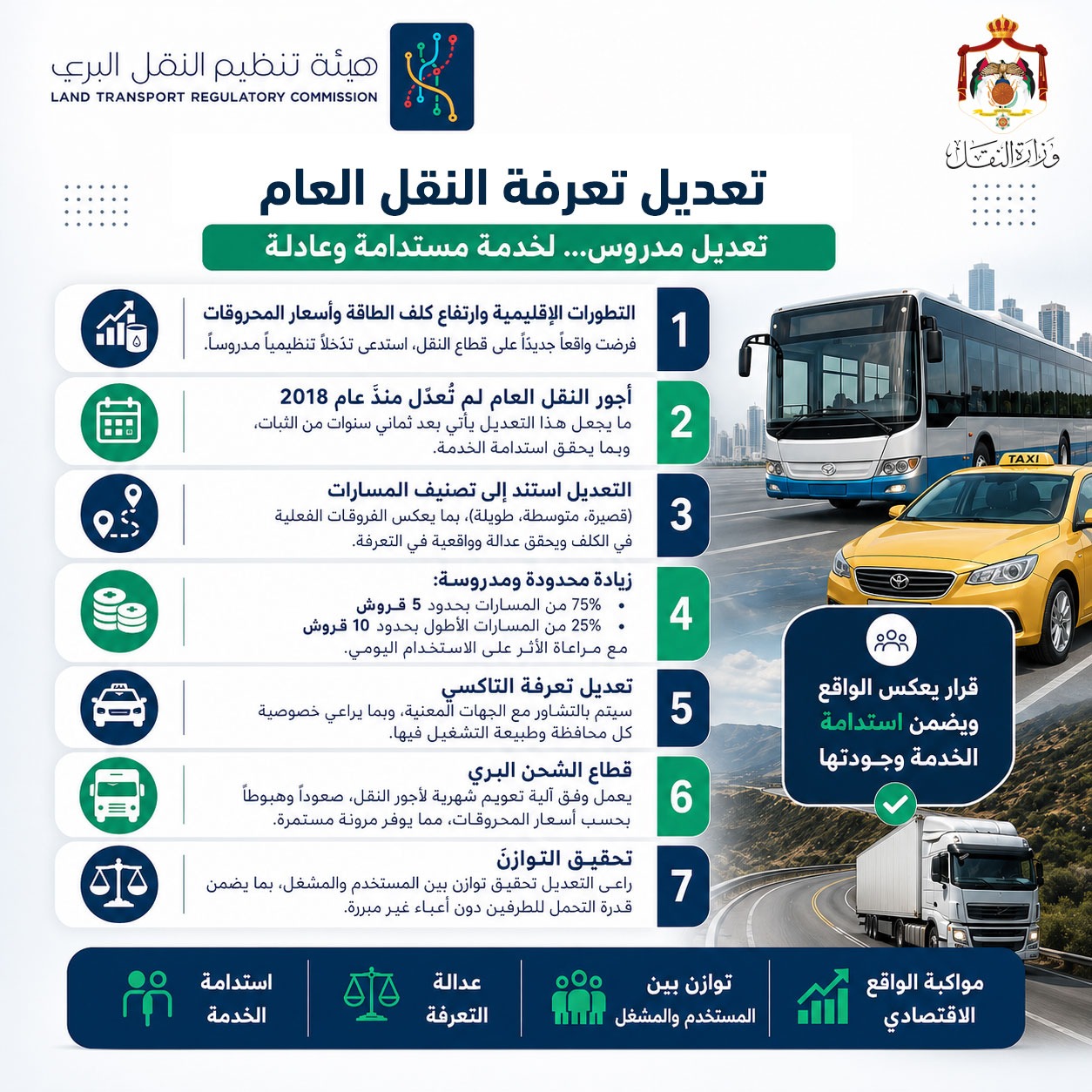 ويهدف القرار إلى استمرارية خدمات النقل العام ومنع تراجعها، من خلال تحقيق توازن مدروس بين البعد الاجتماعي ومتطلبات التشغيل، بما يضمن استدامة القطاع وقدرته على الاستجابة للمتغيرات.