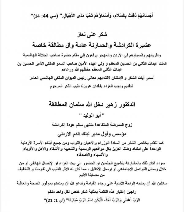 شكر على تعاز بوفاة الدكتور زهير المطالقة