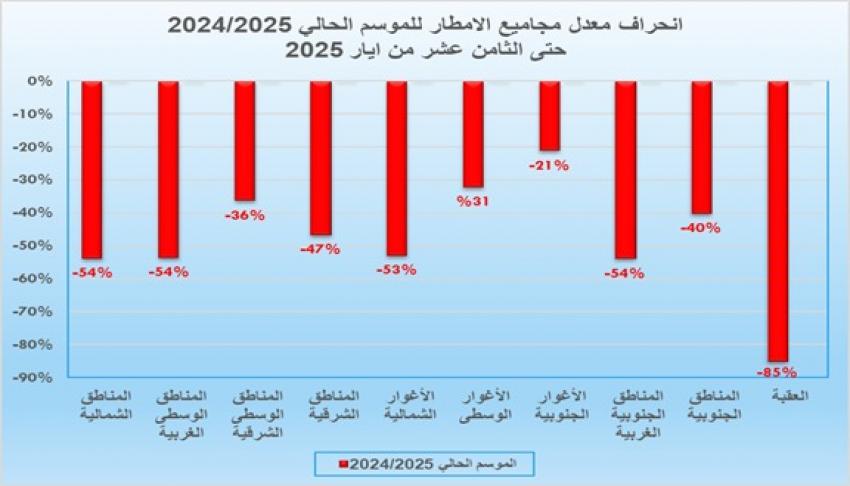 وأشار آل خطاب إلى أن منطقة الأغوار الجنوبية سجّلت أفضل أداء مطري في المملكة لهذا الموسم بنسبة 79% من معدلها السنوي، في حين سجّلت مدينة العقبة الأداء الأضعف بنسبة لم تتجاوز 15% فقط من معدلها الموسمي. كما سُجّل أعلى مجموع مطري لهذا الموسم في محطة رأس منيف بواقع 303.3 ملم، وهو ما يشكّل 52% من معدلها الموسمي العام.