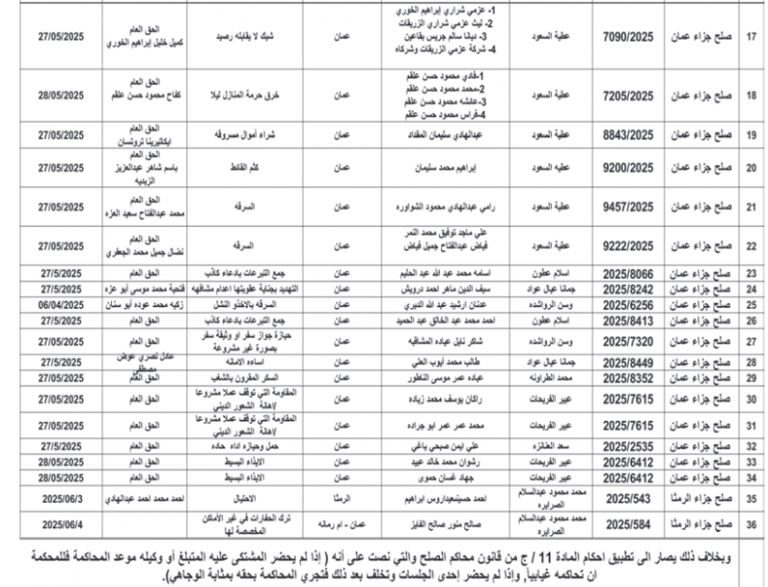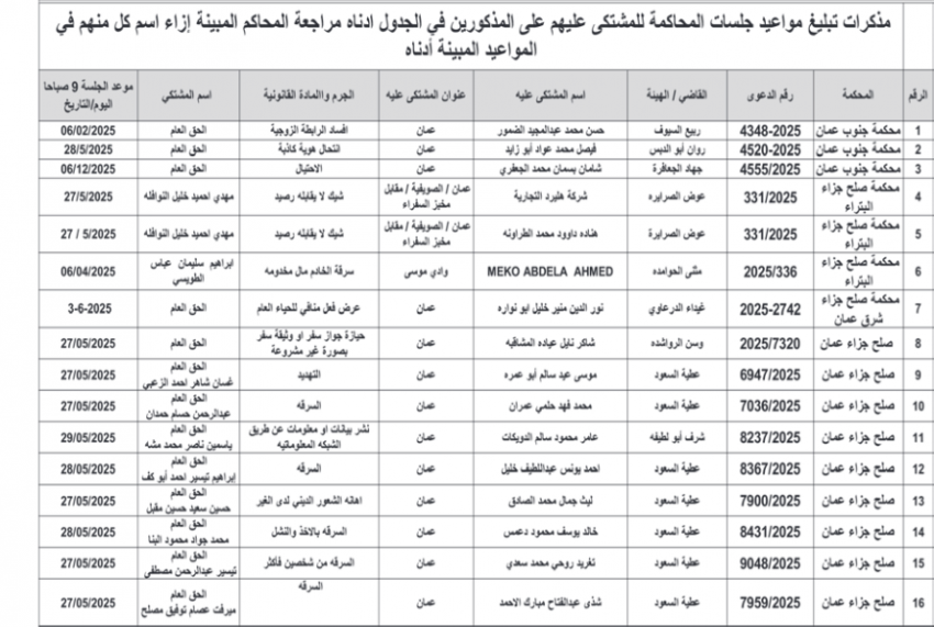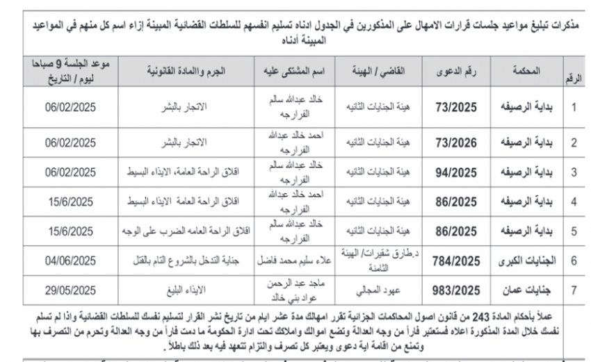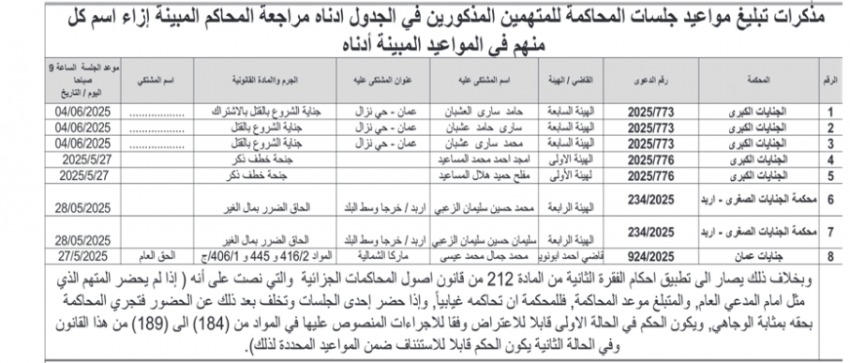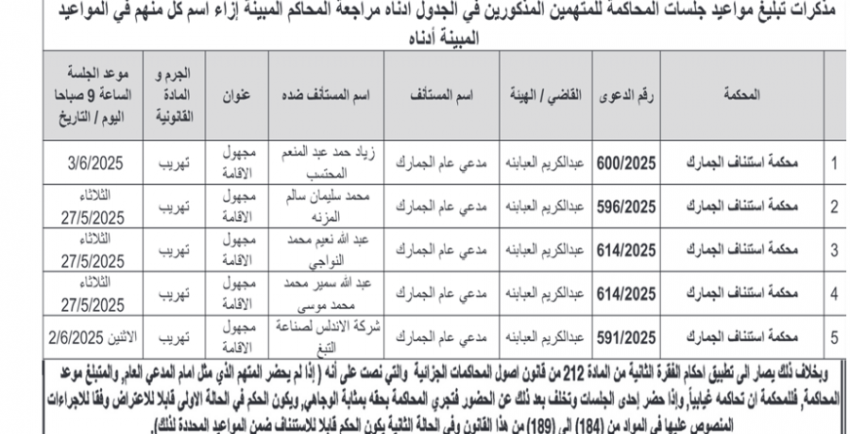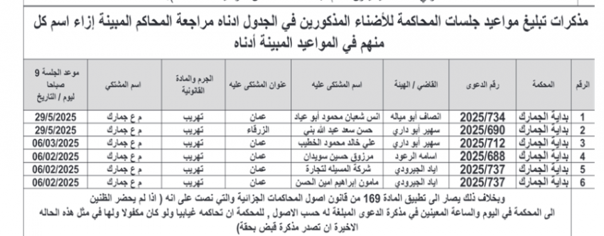 للعلّم - صدرت اليوم الثلاثاء، مذكرات تبليغ مواعيد جلسات محاكمات لمشتكى عليهم بتهم مختلفة وقرارات إمهال لحضور جلسات محاكمة.